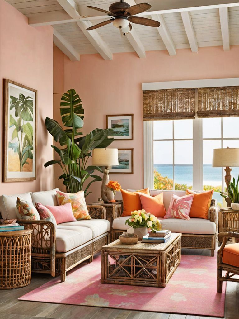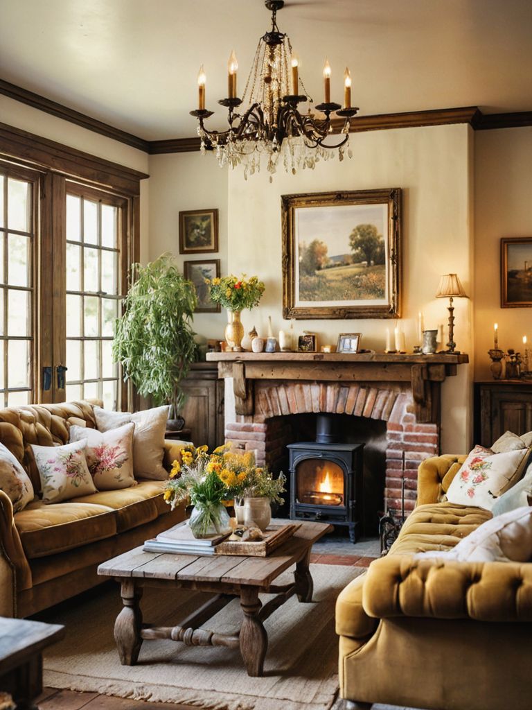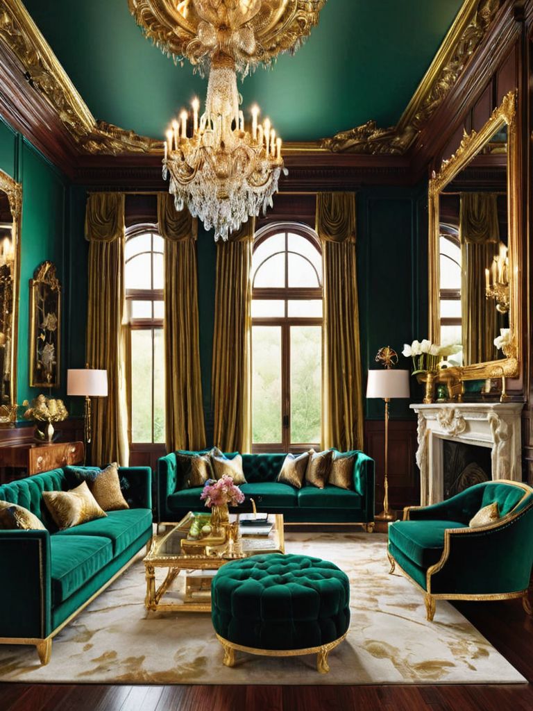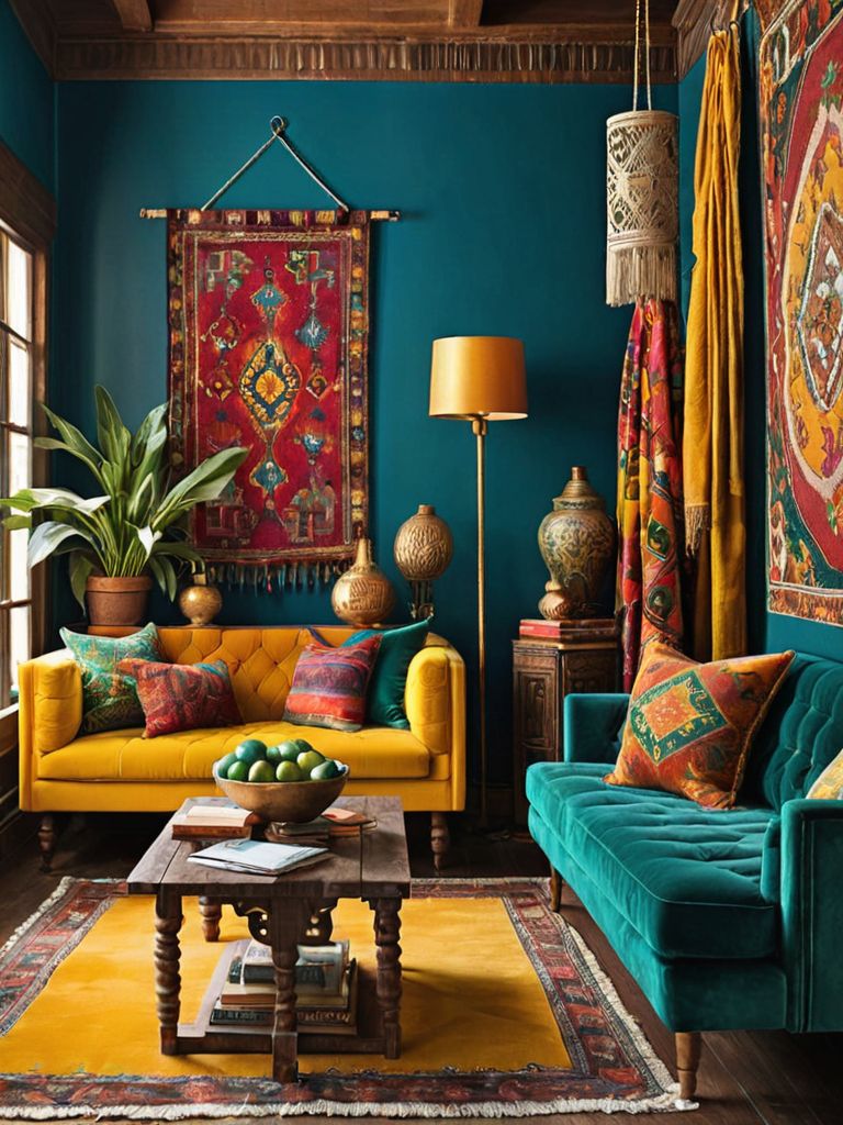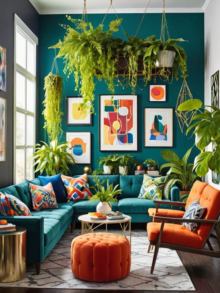Plush velvet sofa, Vibrant cushions, Marble coffee table, Ceramic vases, Statement abstract paintingDescription