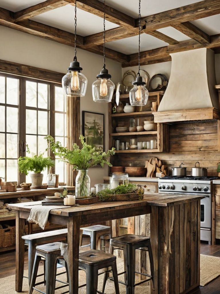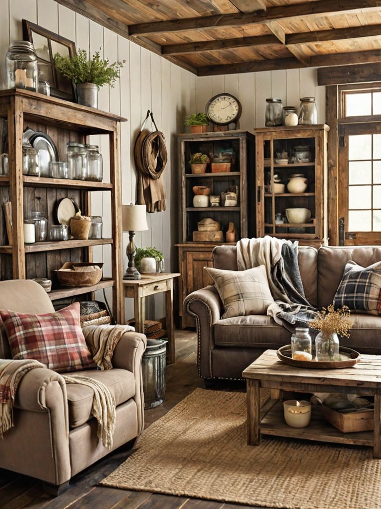 Exposed wood beams, Reclaimed barn doors, Distressed furniture, Plush textiles in earthy tones, Vintage accentsDescription