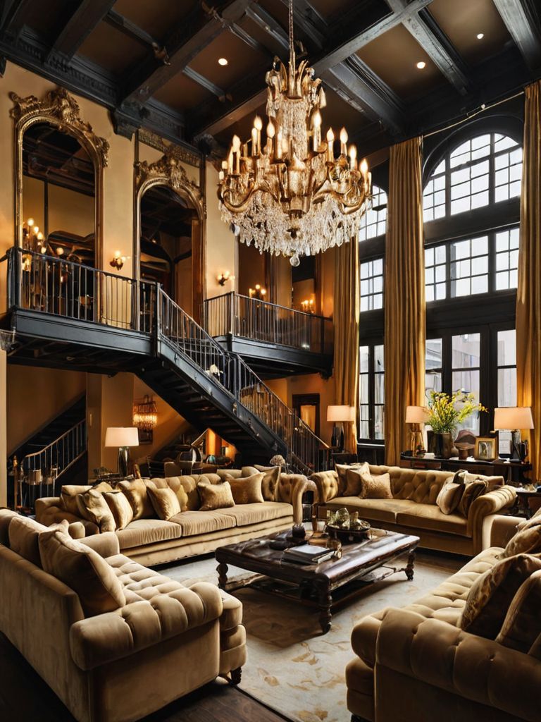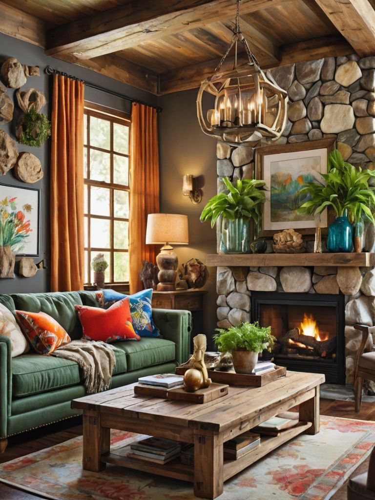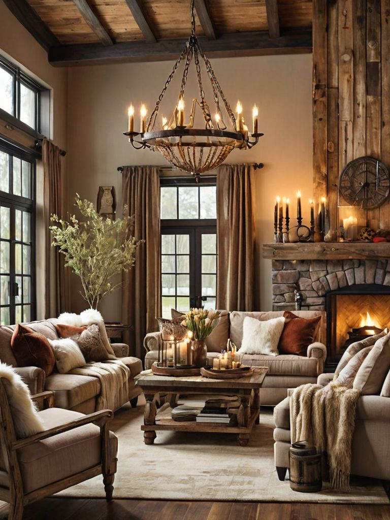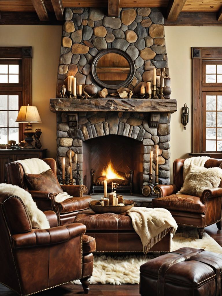 Rustic Elegance: Imagine stepping into a charming cabin nestled among towering pine trees. The interior is adorned with reclaimed wood accents, plush leather furniture, and a stone fireplace. The soft glow of vintage lanterns illuminates the room, casting a warm and inviting ambiance.