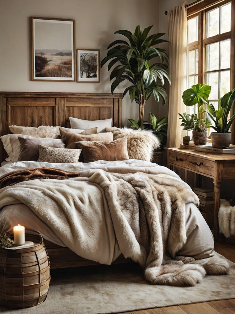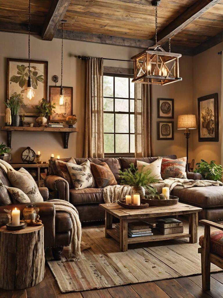 Reclaimed wood accents, Distressed furniture, Vintage-inspired decor, Plaid throws, Fluffy pillowsDescription