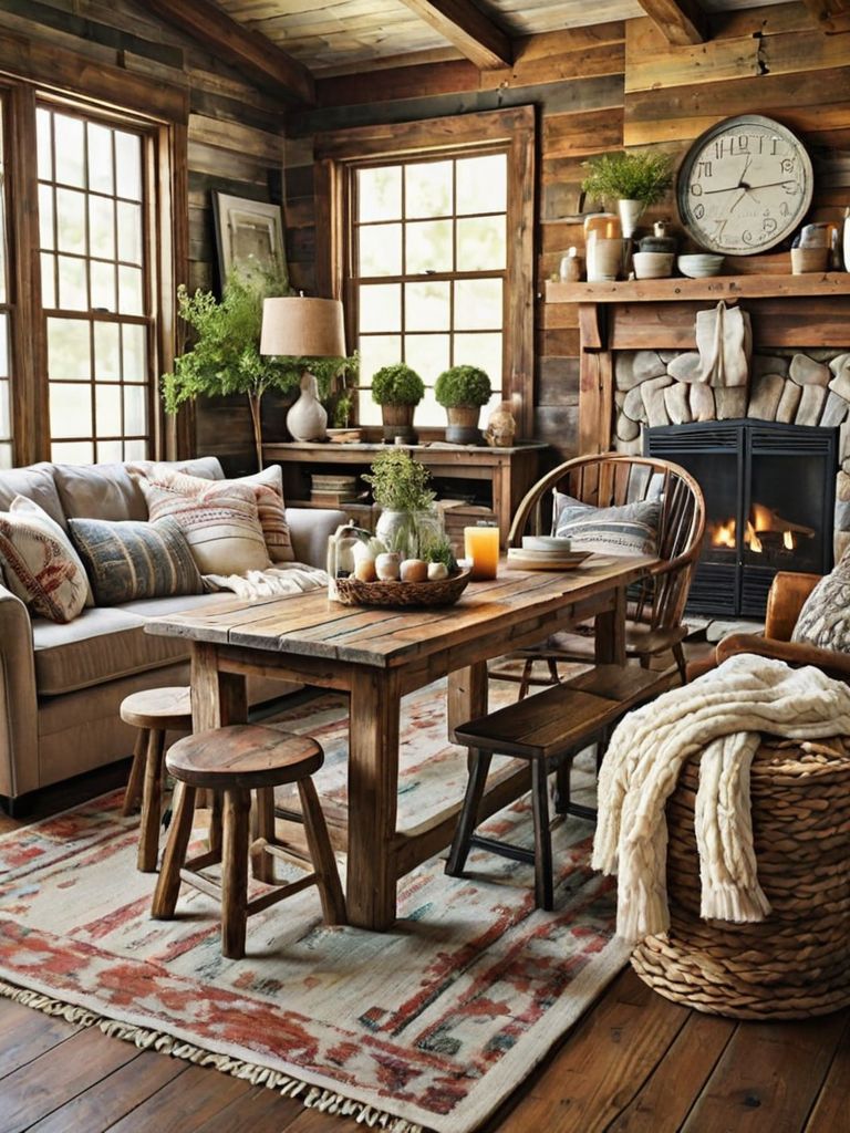 Barn door coffee table, Floating shelves made from reclaimed wood, Plush blankets, Textured throw pillows, Earthy-toned home decor accessoriesDescription