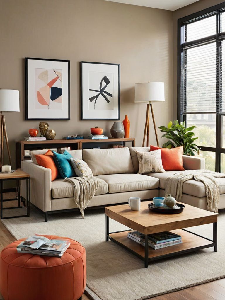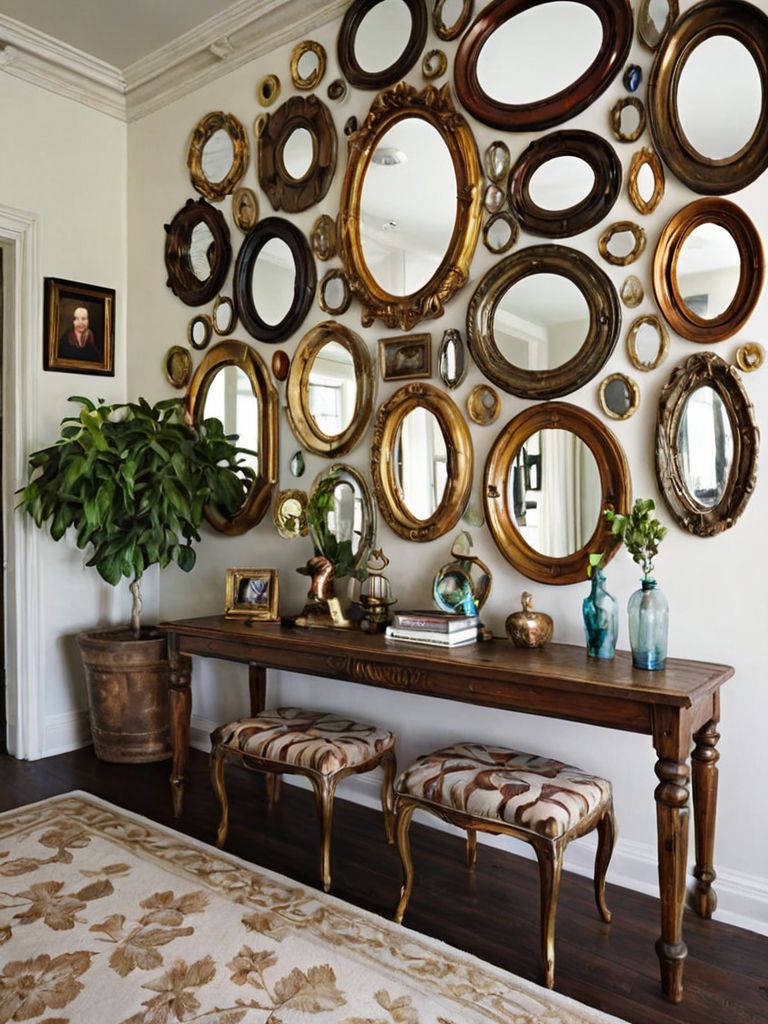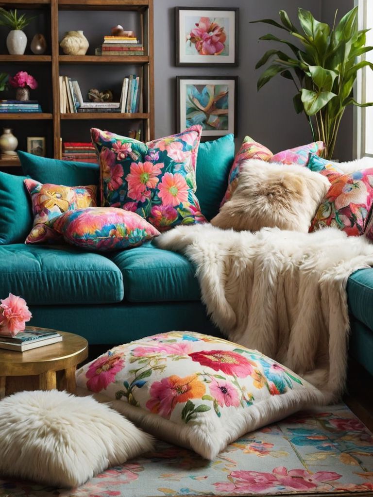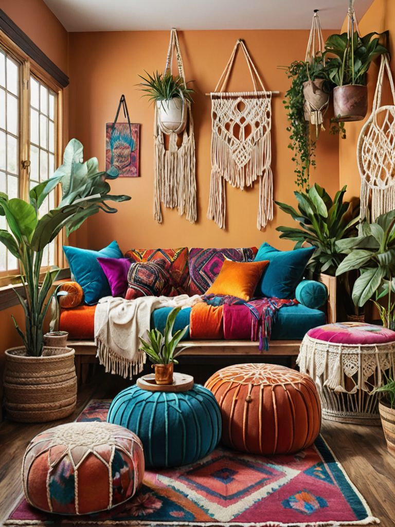 Bohemian oasis: Create a dreamy and eclectic living space by combining vibrant colors, patterns, and textures. Start by layering an assortment of plush throw pillows in rich jewel tones on a cozy vintage velvet sofa, and then hang a draped canopy of sheer curtains to add a touch of elegance. Complete the look with a collection of globally-inspired artwork and an assortment of potted plants to create a bohemian sanctuary in your own home.