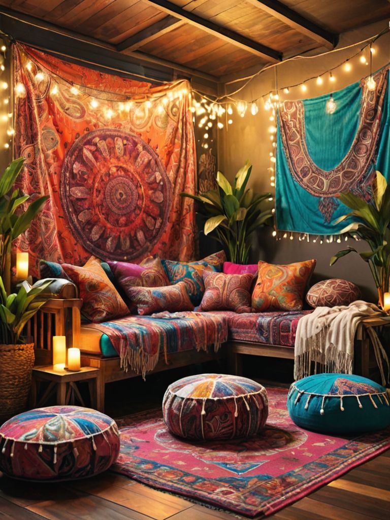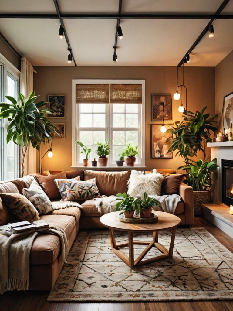 Rustic Retreat: Transform your living room into a cozy haven with our home decorating idea. Incorporate elements like chunky knit throws and plaid pillows for a touch of warmth while surrounding yourself with exposed wood beams and distressed furniture for a rustic charm. Complete the look with soft ambient lighting and a crackling fireplace for the ultimate relaxation sanctuary.