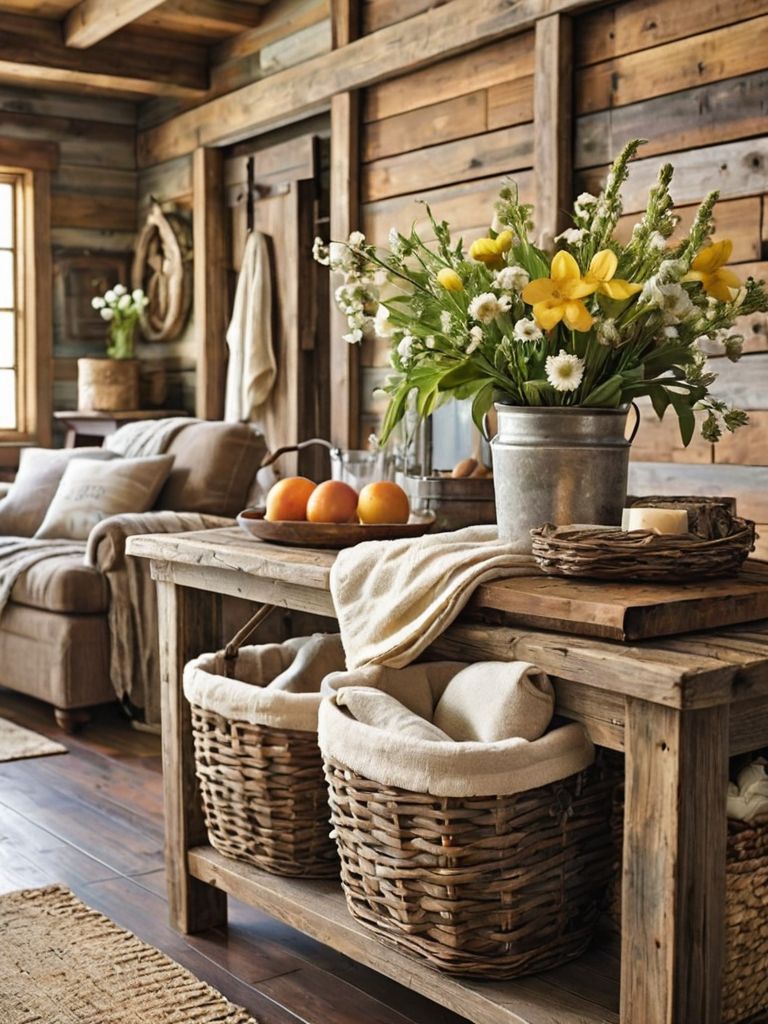 Chunky knit throws, Plaid pillows, Exposed wood beams, Distressed furniture, Soft ambient lightingDescription