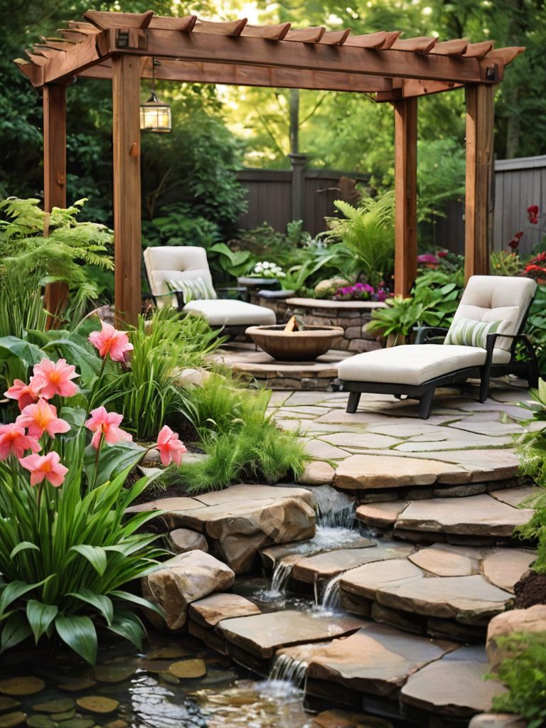 Luscious green plants, Hanging macrame planters, Cascading vines, Rattan furniture, Colorful patterned cushions and throwsDescription