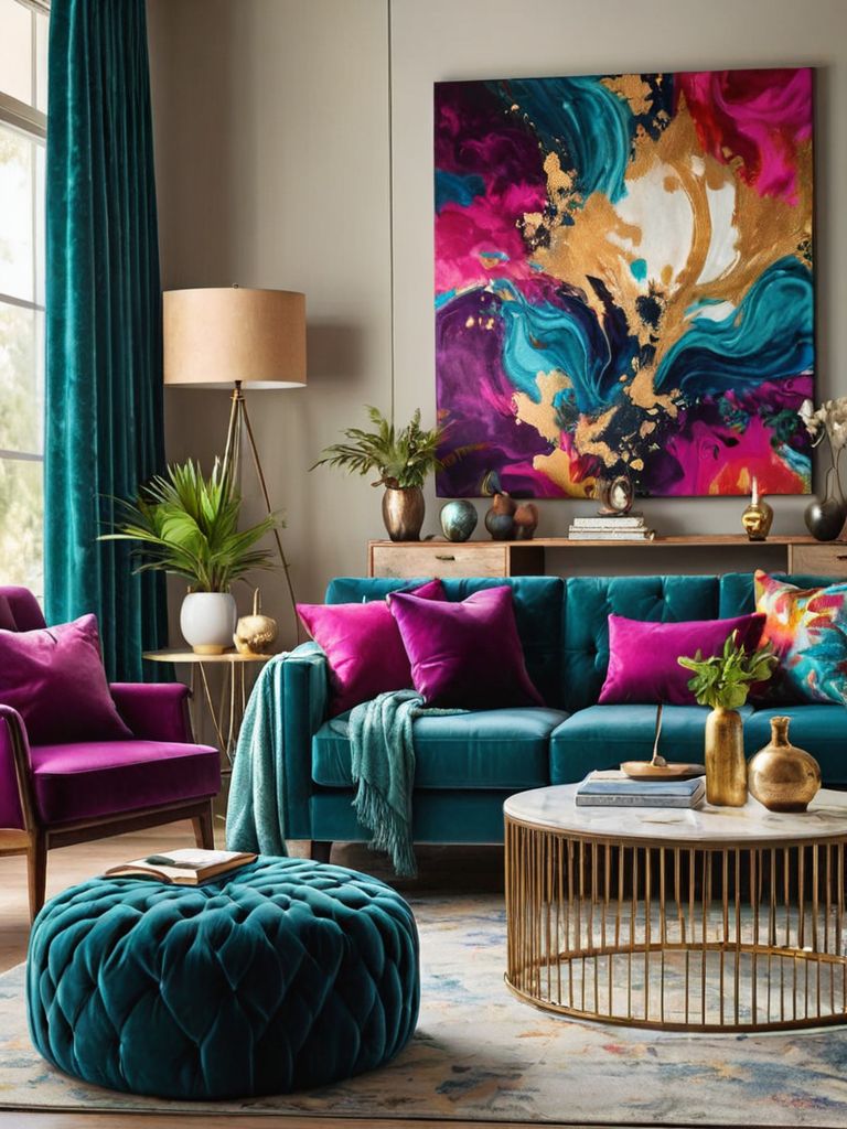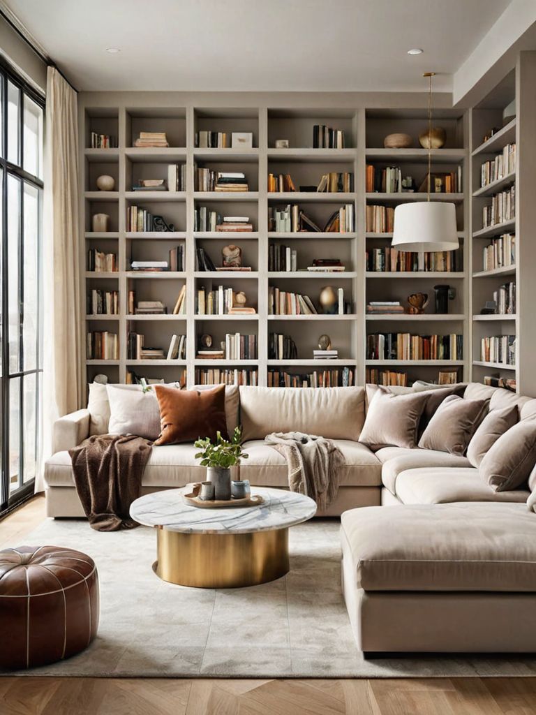 Indulgence: Imagine a cozy living room warmly adorned with rich burgundy velvet curtains, complemented by plush cream-colored sofas. A fireplace serves as the focal point, with intricately carved wooden mantel and flickering flames casting a comforting glow. The room is accented with curated shelves housing a collection of vintage books, antique teacups, and delicate porcelain figurines, creating a space that is both elegant and inviting.