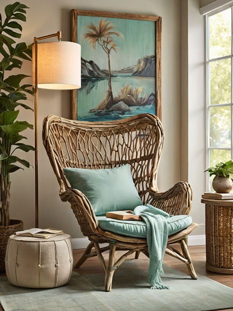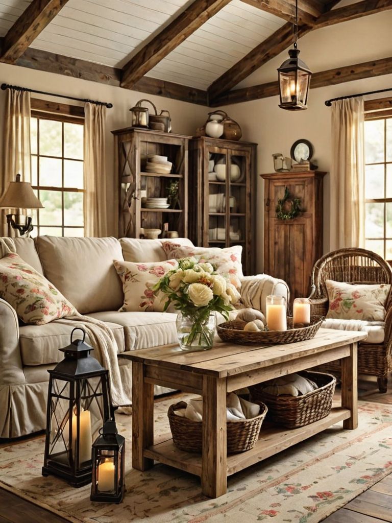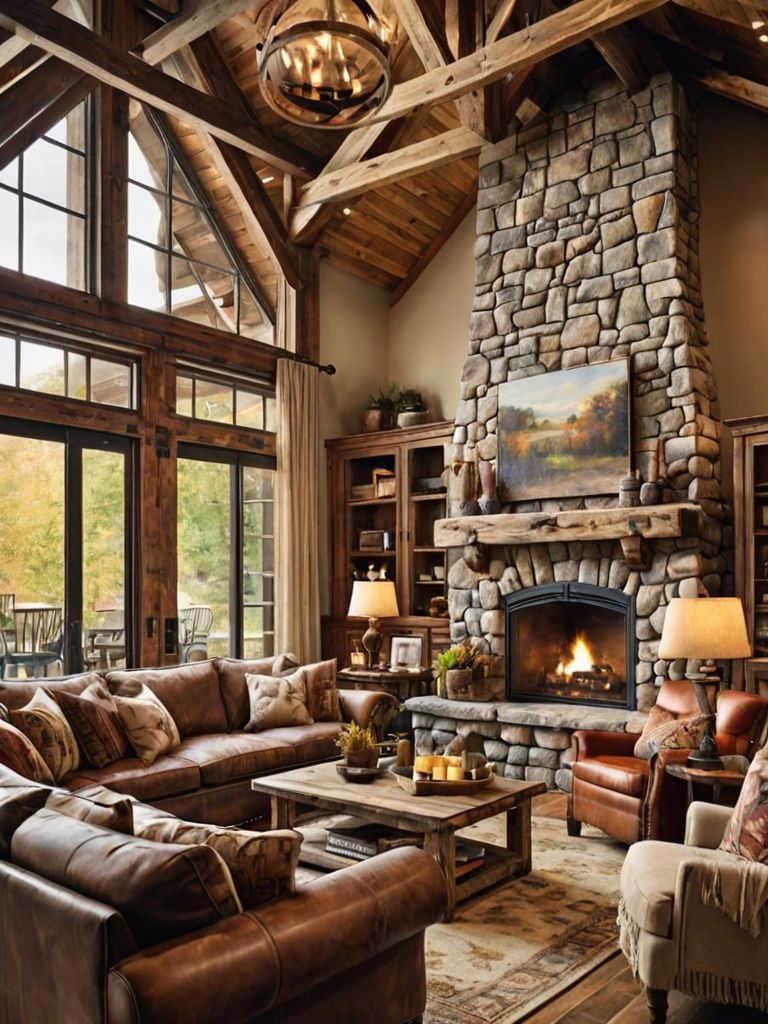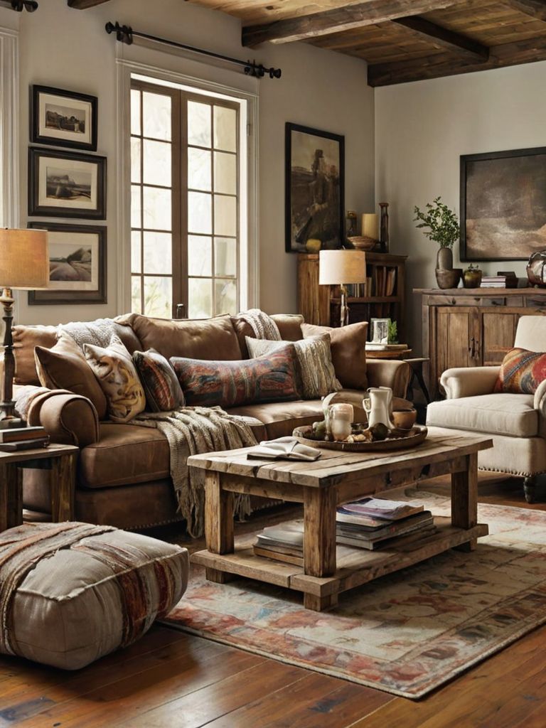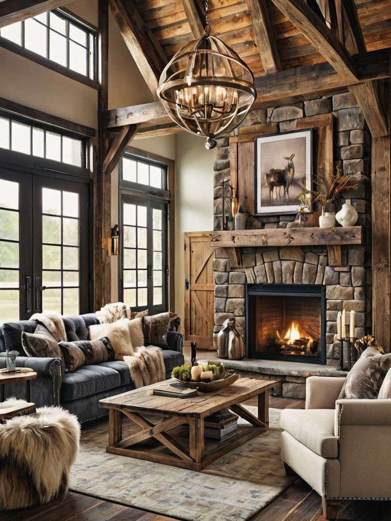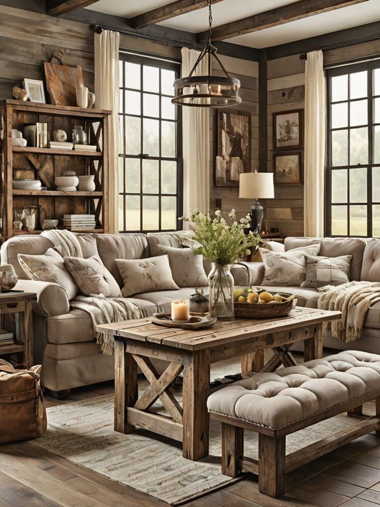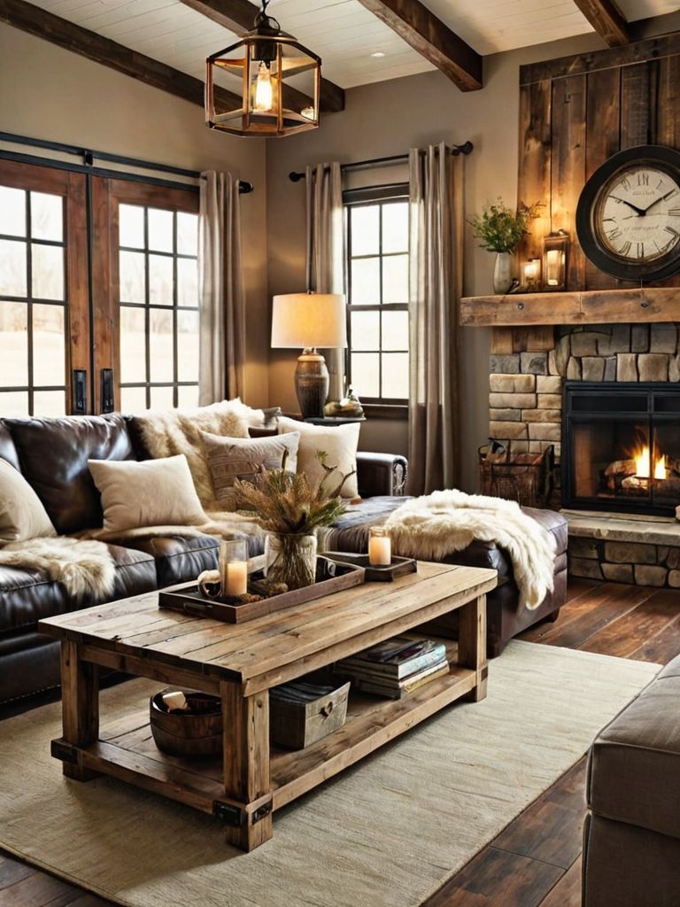 Weathered wood furniture, Oversized sofas and chairs, Soft neutral tone decor, Vintage decor accents, Cozy fireplaceDescription