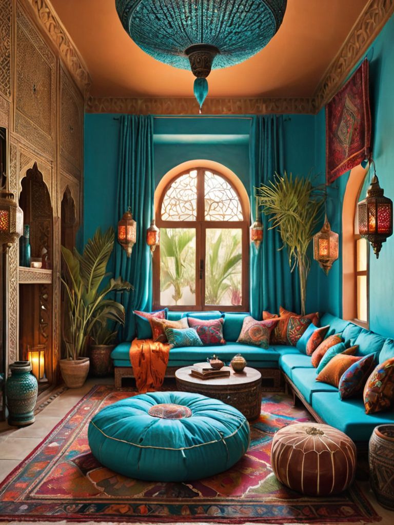 Delicate chandelier, Ornate picture frames, Plush velvet sofa, Embroidered cushions, Luxurious rugDescription
