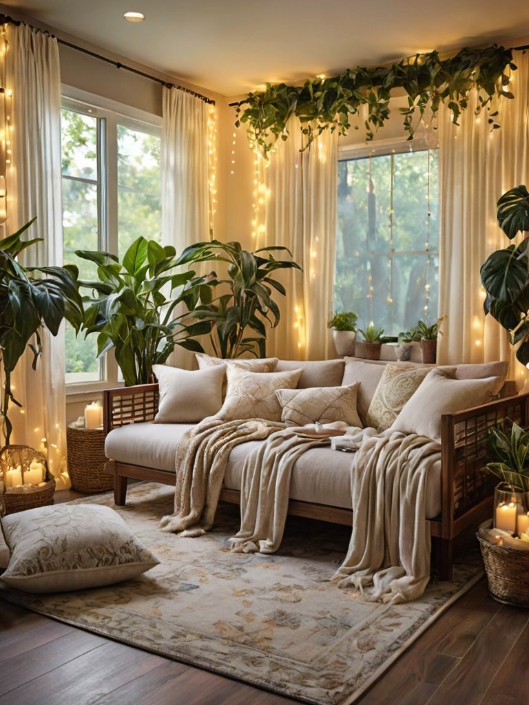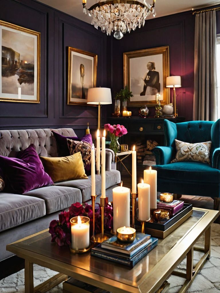 Candlelit Haven: Transform your space into a cozy retreat with this home decorating idea. Fill your living room with plush, velvet furniture in deep, jewel-toned hues, and adorn the walls with contemporary art pieces in gold frames. Complete the look with soft, ambient lighting from strategically placed candles, creating a warm and inviting atmosphere perfect for relaxation and intimate gatherings.