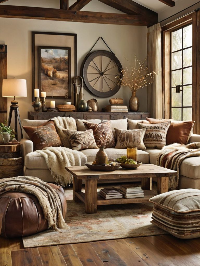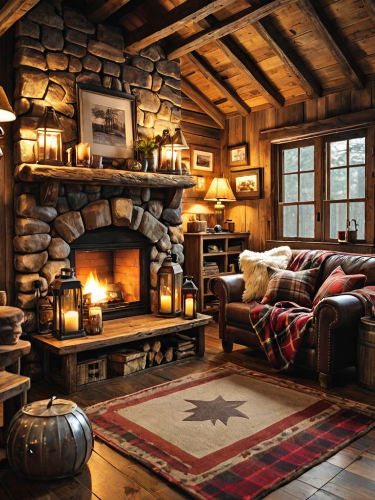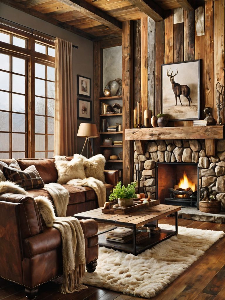 Rustic Retreat: Create a cozy cabin-inspired living room with a striking stone fireplace as the centerpiece, flanked by built-in bookshelves showcasing a curated collection of vintage books and nature-inspired decor. Adorn the walls with reclaimed wood paneling, complemented by warm earth tones and plush leather seating, creating an inviting and serene space perfect for relaxation and entertaining. Enhance the ambiance with soft lighting from a wrought iron chandelier and large windows that offer breathtaking views of the surrounding countryside.