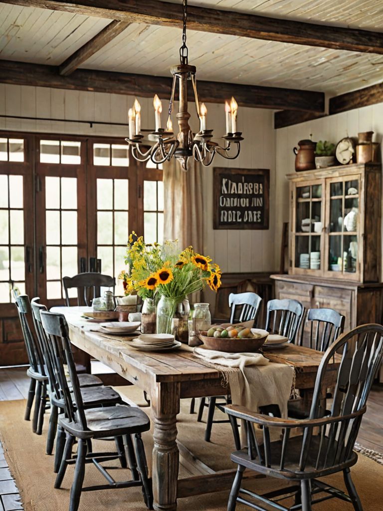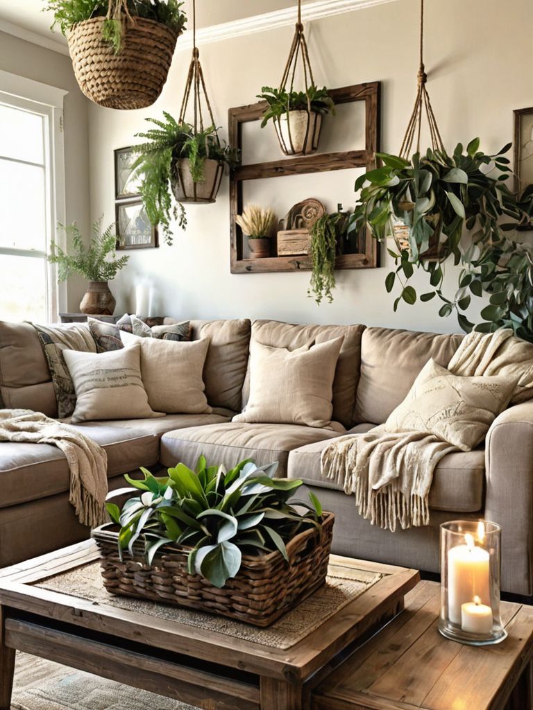 Wooden feature wall, Reclaimed barn wood floating shelves, Plush leather sectional sofa, Metal accents, Vintage-inspired lighting fixturesDescription