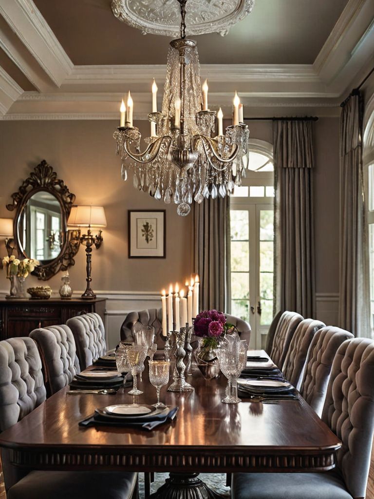 Elegant Dining Room Setting: Create a stunning dining experience with a mix of classic and contemporary elements. Start with a grand mahogany table adorned with ornate silver candlestick holders and delicate crystalware. Accentuate the space with plush velvet dining chairs in deep, regal hues, complemented by a shimmering chandelier suspended from the ceiling, casting a warm and inviting glow.