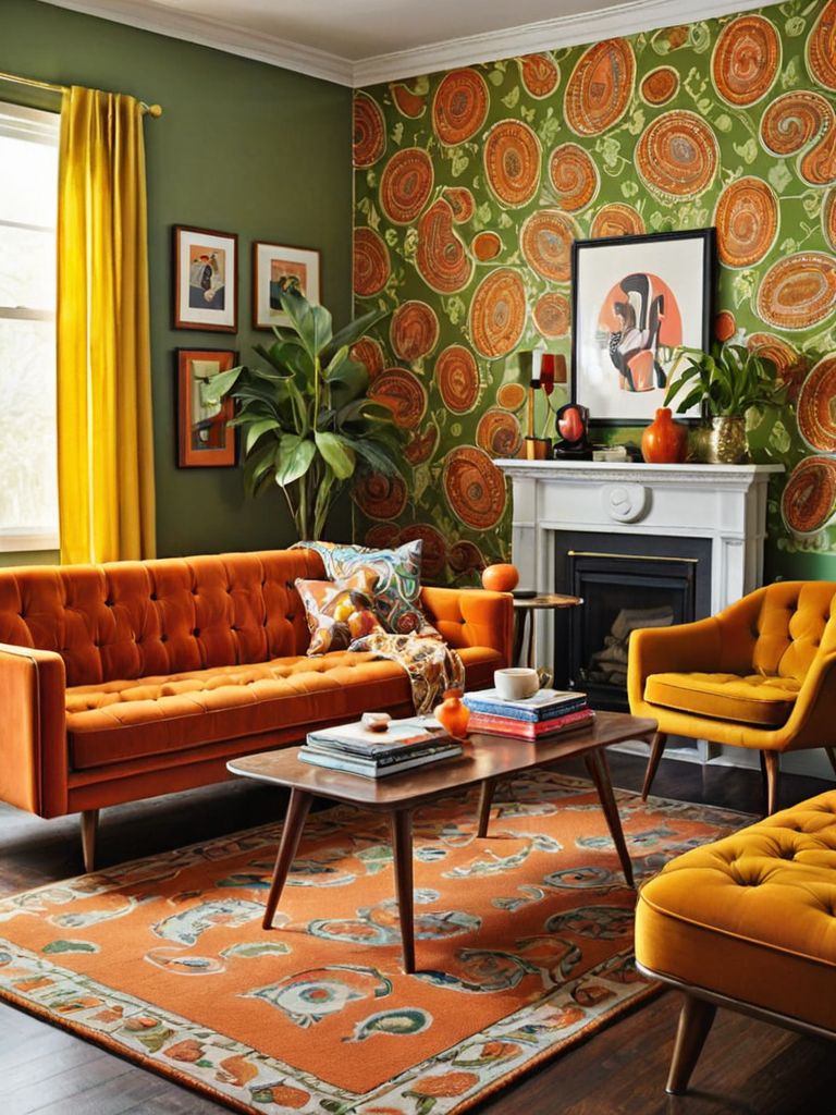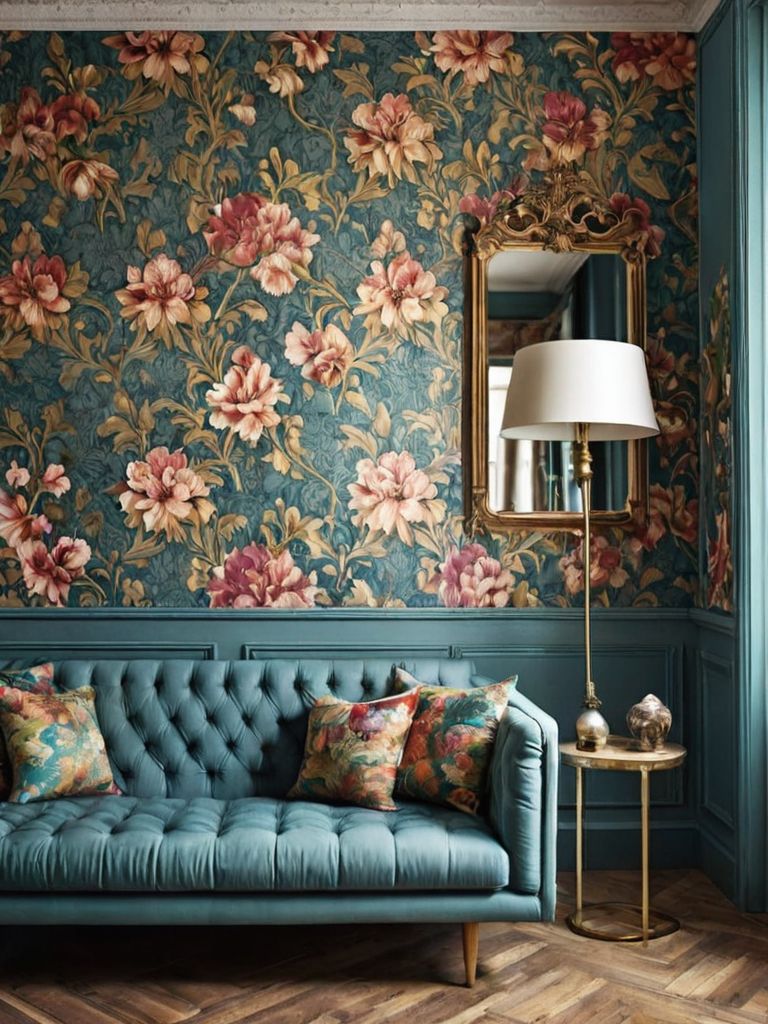 Distressed wood coffee tables, Soft floral upholstery, Antique picture frames, Shiplap paneling, Plaid throw pillowsDescription