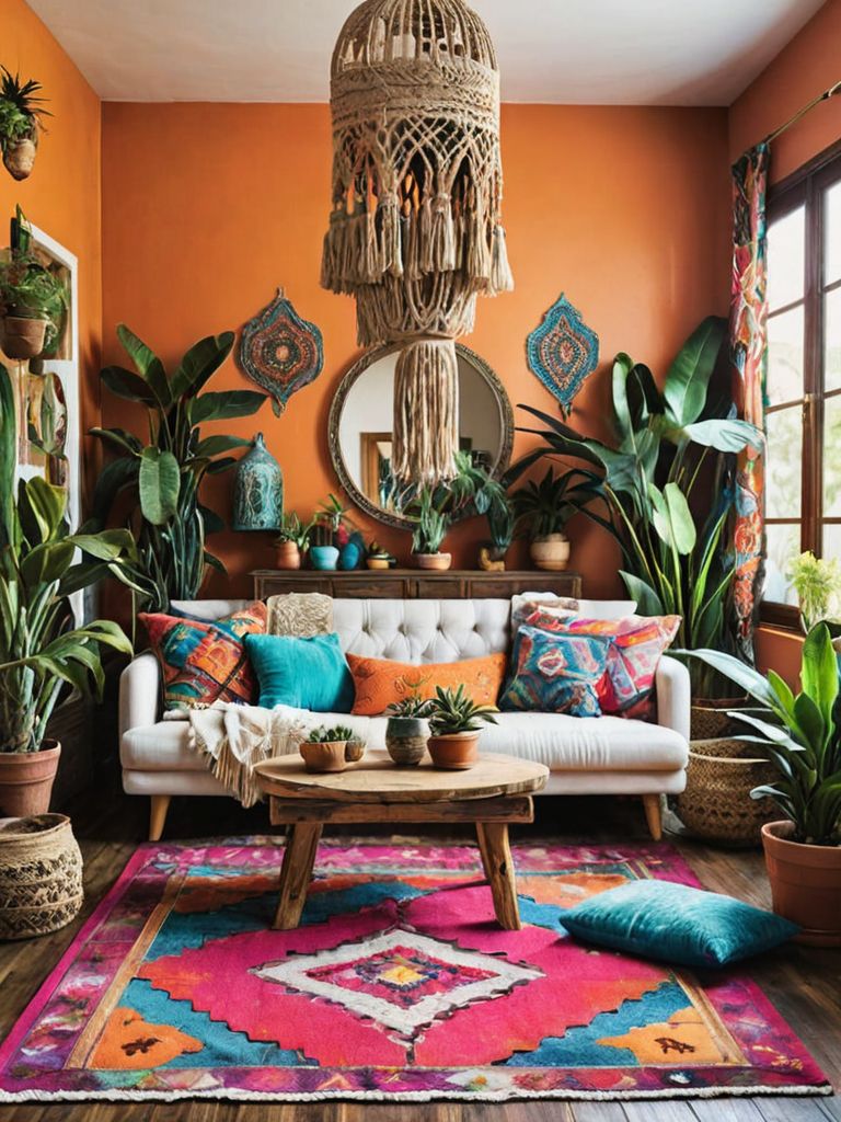 Reclaimed wood accent wall, Ornate metal shelves, Vintage mason jars, Earth-toned throw pillows, Plush faux fur rugDescription