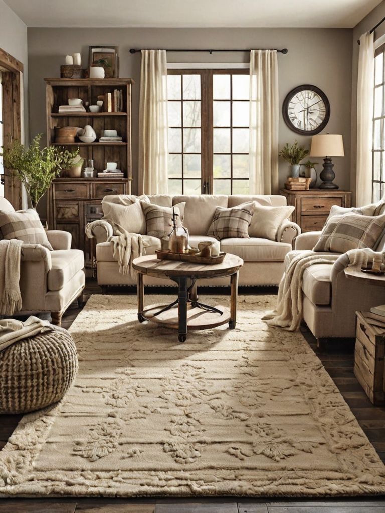 Idea Imagine stepping into a cozy farmhouse kitchen, filled with rustic charm and warmth. The walls are adorned with shiplap paneling, painted in a creamy white, while distressed wooden shelves display a collection of vintage mason jars and antique kitchen tools. The centerpiece of the room is a large farmhouse table, surrounded by mismatched wooden chairs and topped with freshly picked flowers in a mason jar vase.