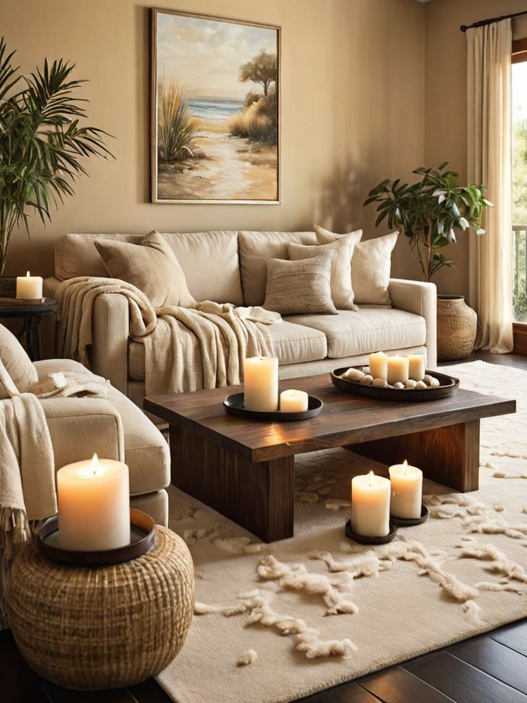 Soft sandy-hued throw pillows, Distressed wood coffee table, Sea-inspired throw blanket, Seashell decor, Tropical plant potDescription