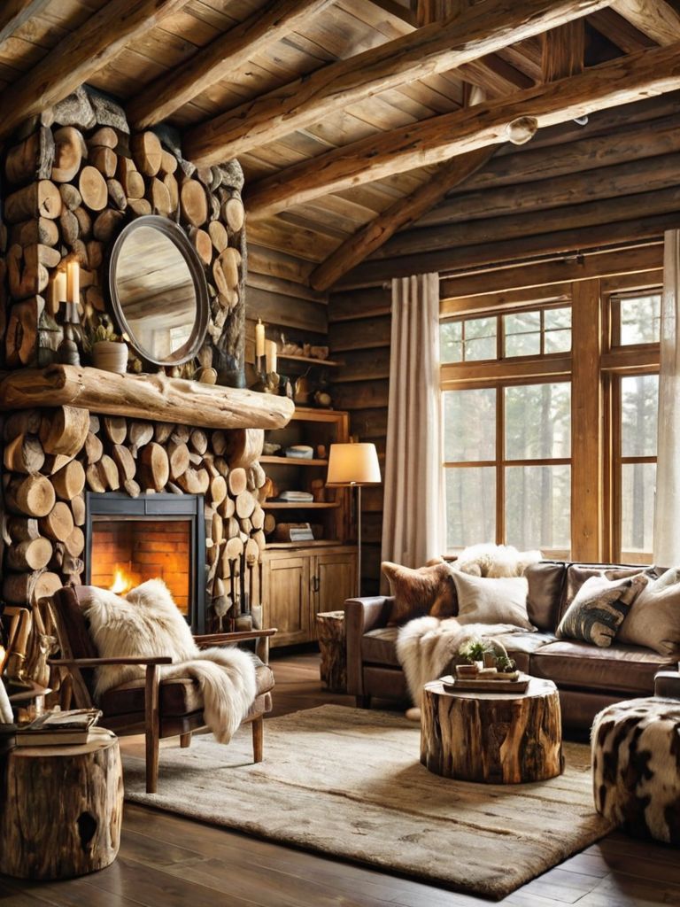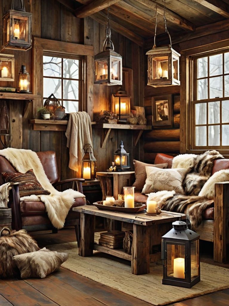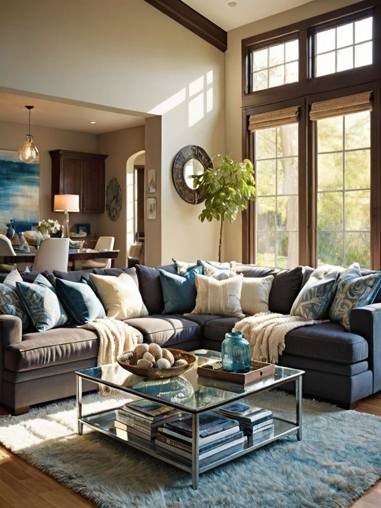 Silk drapes, Sectional sofa, Velvet throw pillows, Crystal candleholders, Marble coffee tableDescription