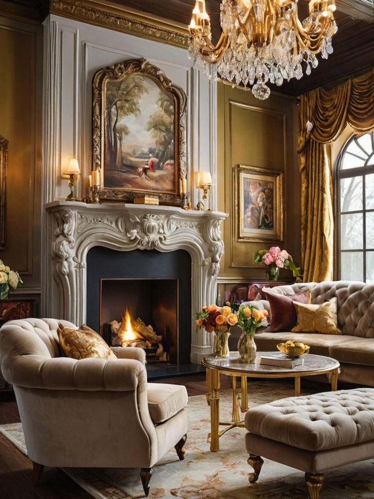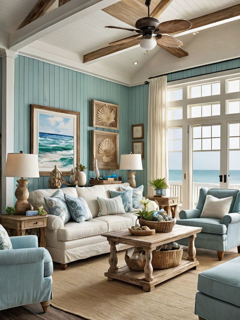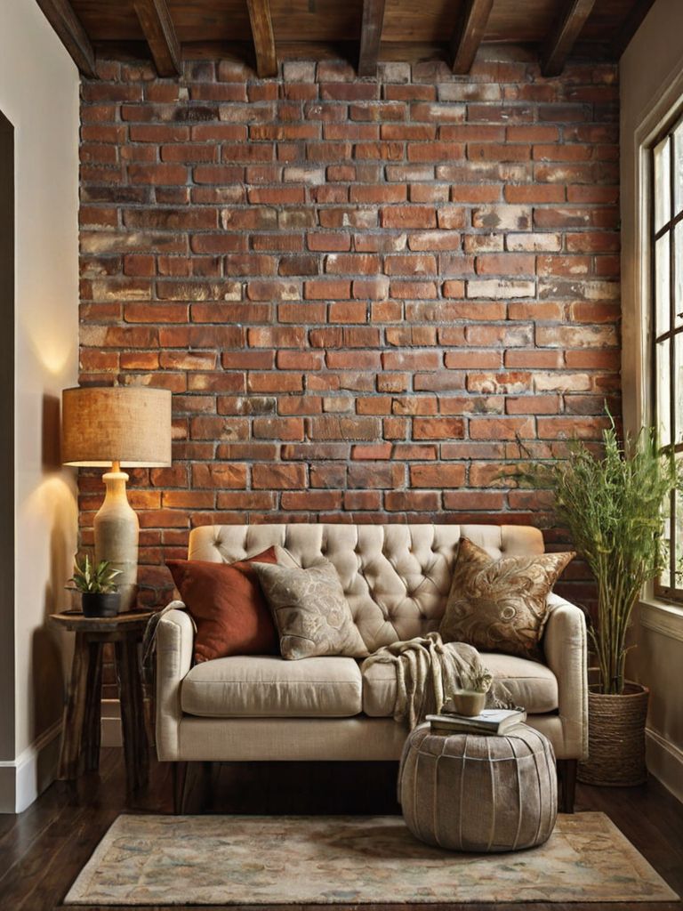 A charming rustic farmhouse-inspired living room awaits, blending natural elements with cozy textures. Weathered wood beams frame the vaulted ceiling, while the walls are adorned with vintage botanical prints. Plush sofas covered in soft linen beckon you to sink in and relax, surrounded by warm neutral tones and carefully curated accents of wrought iron and reclaimed furniture.