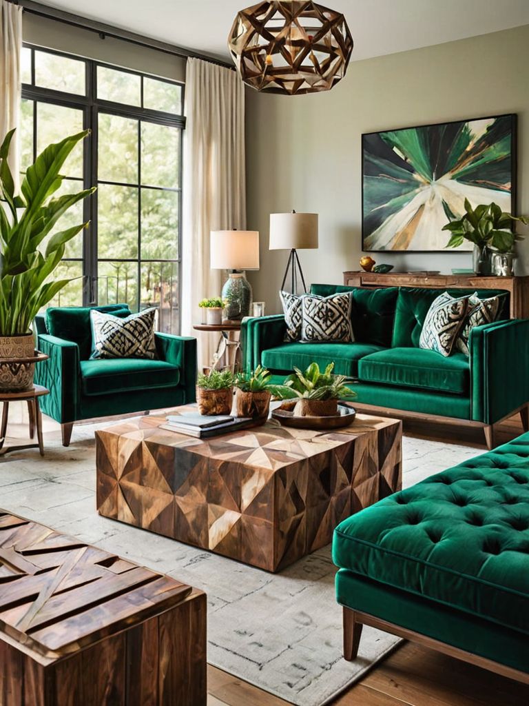 Jewel-toned velvet curtains cascade from the ceiling, framing the floor-to-ceiling windows that flood the room with natural light. On the walls, a collection of intricately framed vintage botanical prints hangs in a perfect symmetrical grid. A plush, emerald green velvet sofa sits in the center of the room, adorned with an array of luxurious velvet throw pillows in rich jewel tones, creating a cozy and inviting atmosphere.