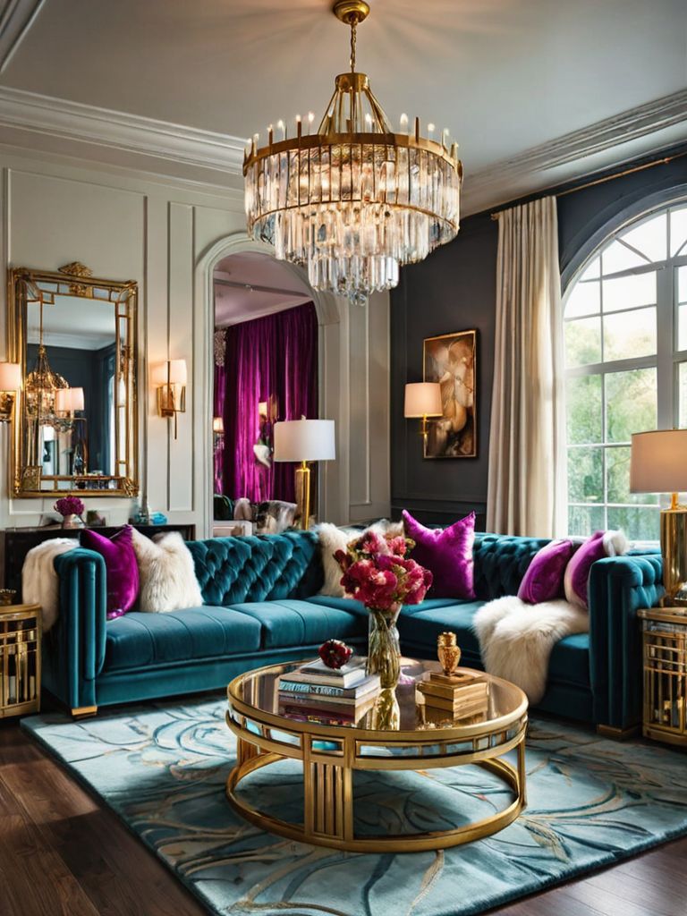 Velvet curtains, Vintage botanical prints, Velvet sofa, Velvet throw pillows, Floor-to-ceiling windowsDescription