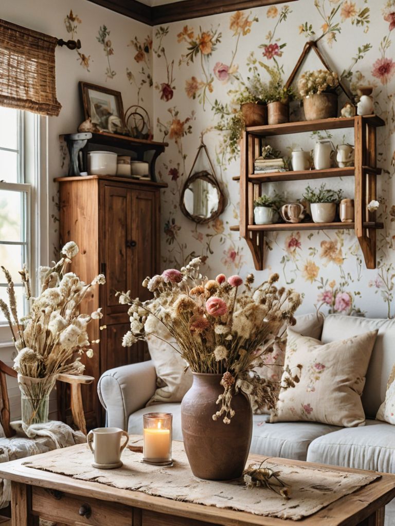 Rustic exposed brick fireplace, Fairy lights, Soft, pastel-colored furnishings, Vintage floral accents, Cozy home decor piecesDescription