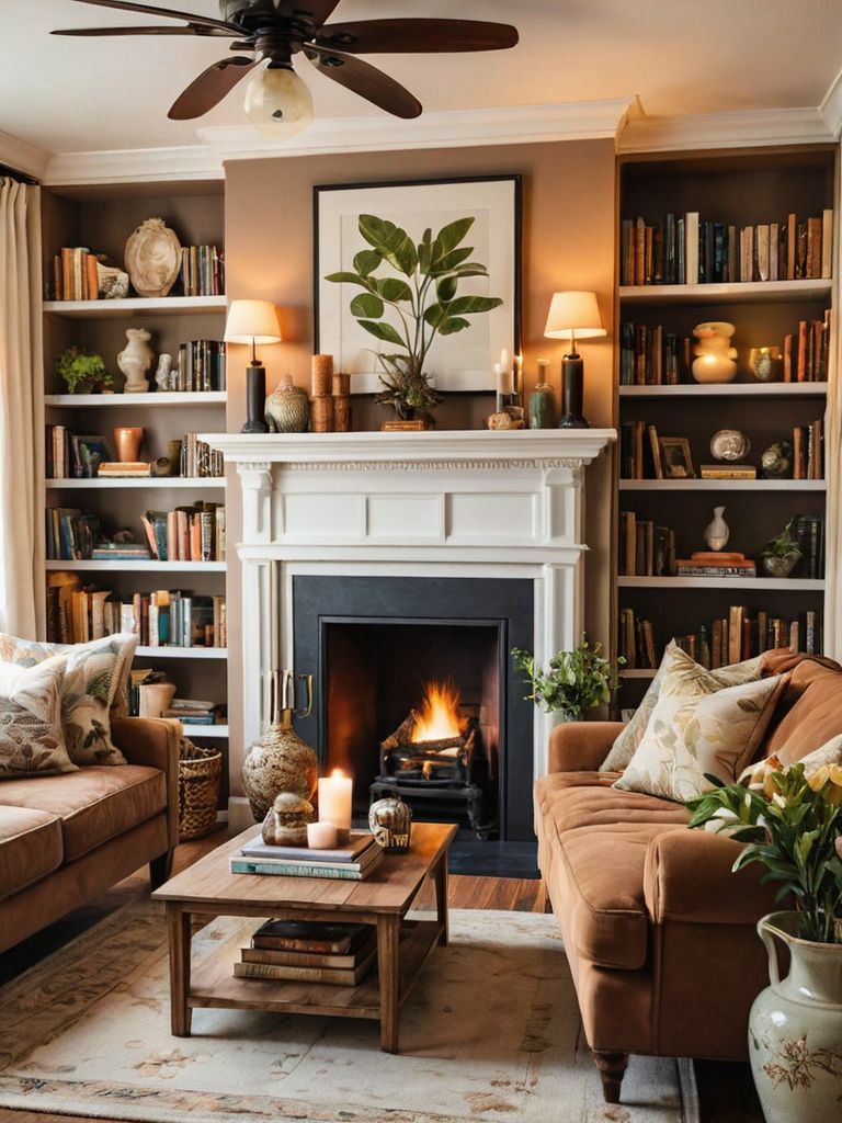Charming Cottage Romance: Step into a world of cozy and elegant home décor with this enchanting idea. Imagine a rustic, exposed brick fireplace adorned with delicate fairy lights, creating a warm and magical ambiance. Soft, pastel-colored furnishings and vintage floral accents complete the look, inviting you to escape the hustle and bustle of everyday life and indulge in blissful tranquility.