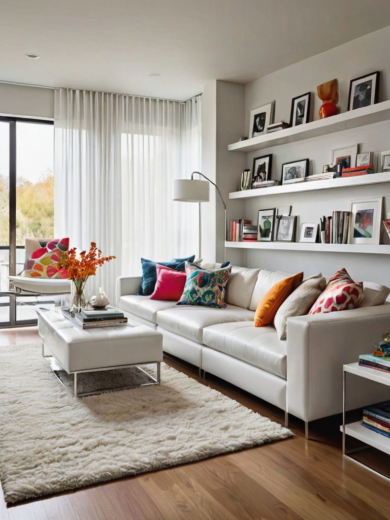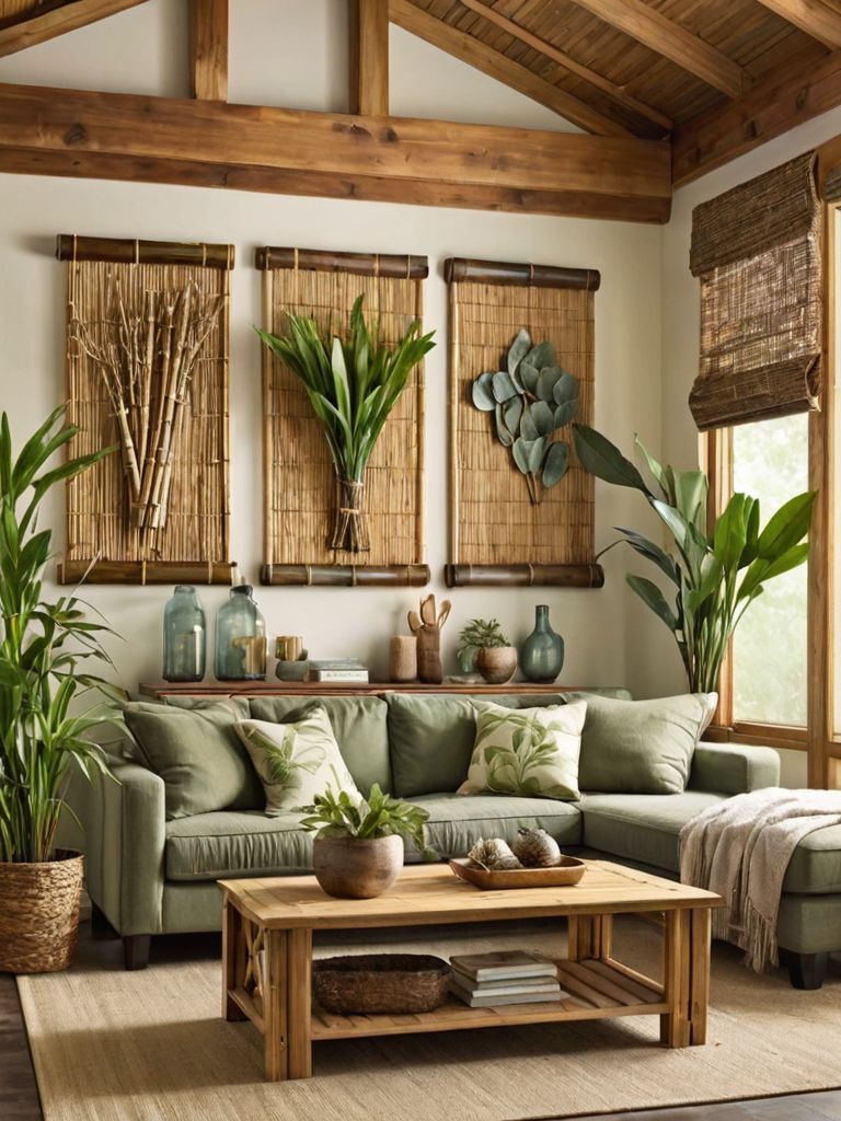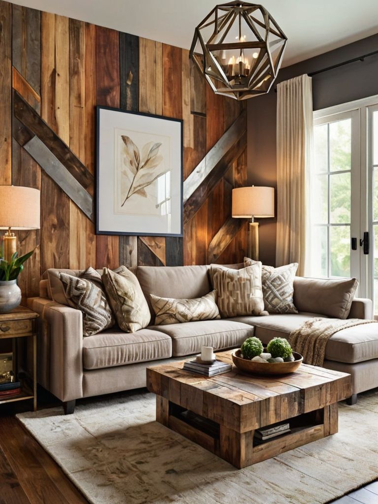 Beige sectional sofa, Reclaimed wood coffee table, Sideboard, Textured throw pillows, Earth-toned rugDescription