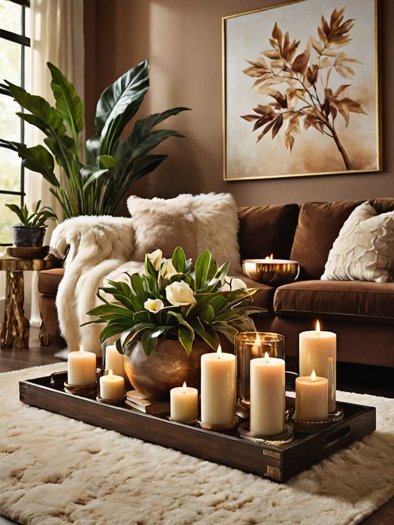 Modern Rustic Living Room Design: Create a warm and inviting space with a blend of contemporary designs and natural materials. Incorporate a cozy beige sectional sofa with plush cushions, complemented by a reclaimed wood coffee table and sideboard. Enhance the room with textured throw pillows, earth-toned rugs, and a statement chandelier to achieve a harmonious and sophisticated ambiance.