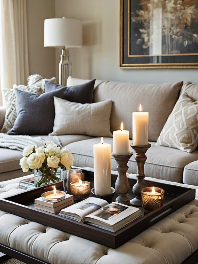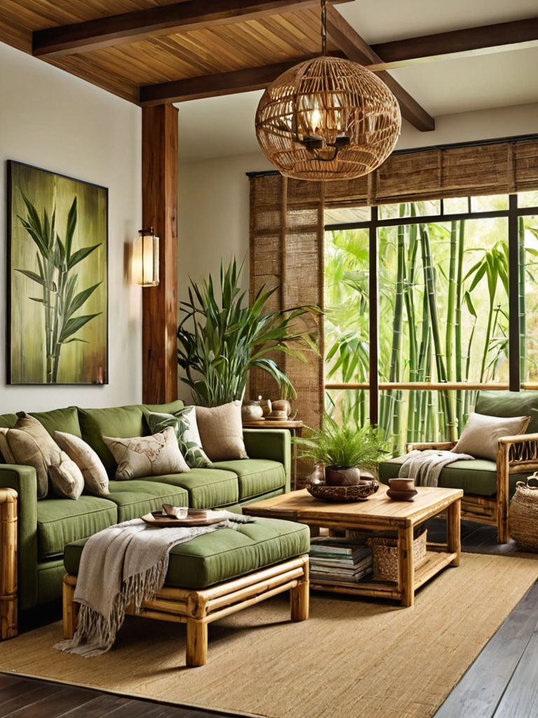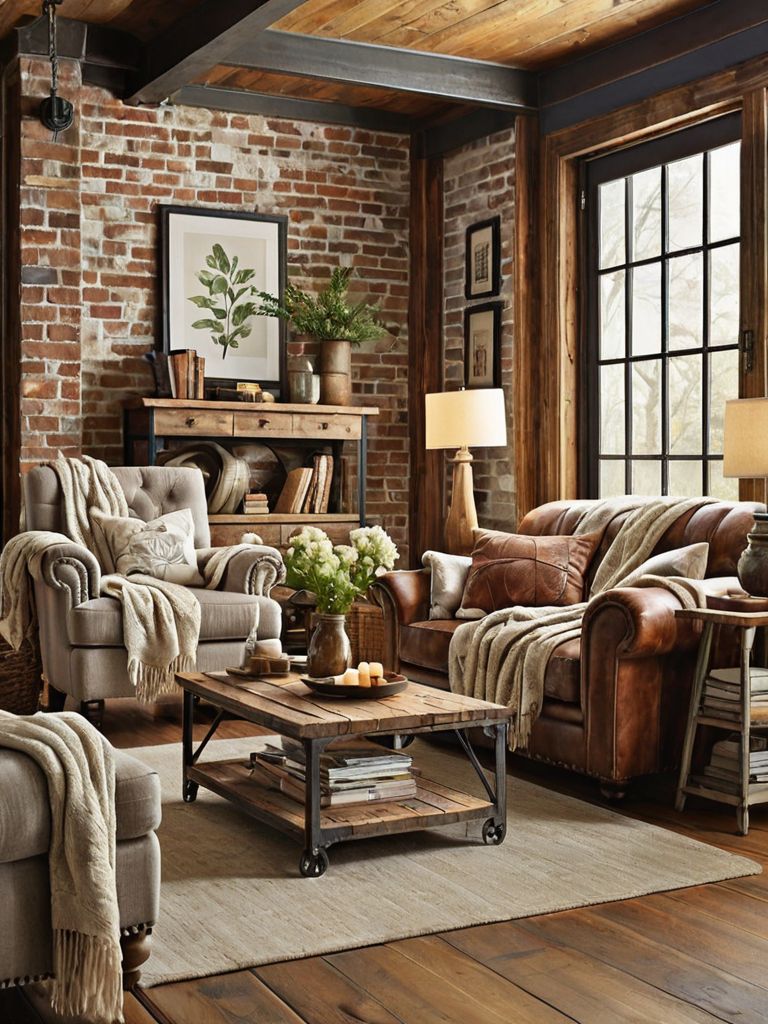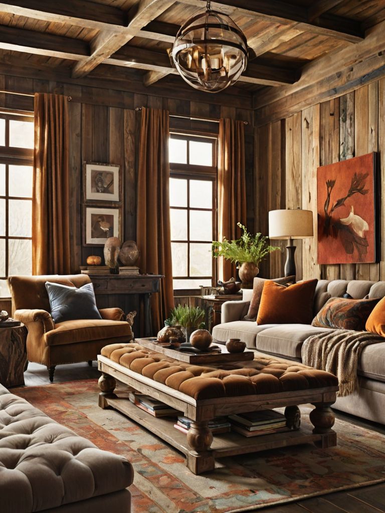 Reclaimed wood coffee table, Earth-toned throw pillows, Vintage-inspired wall art, Stone fireplace insert, Nature-inspired table lampDescription