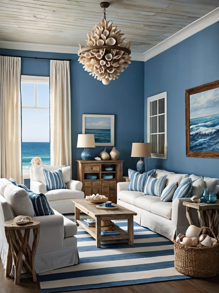 Rhapsody in Blue: Embrace the soothing ambiance of a coastal retreat with this home decorating concept. Picture azure walls reminiscent of the open sea, adorned with whitewashed furniture and seashells delicately displayed on driftwood shelves. Complete the look with nautical striped curtains, plush blue rugs resembling ocean waves, and a seashell chandelier casting a soft, ethereal glow.