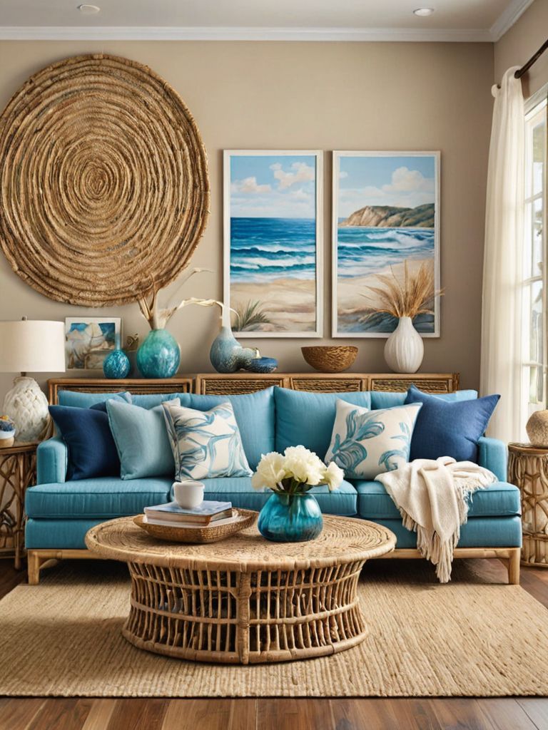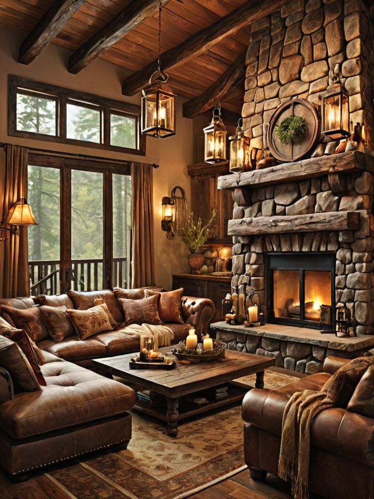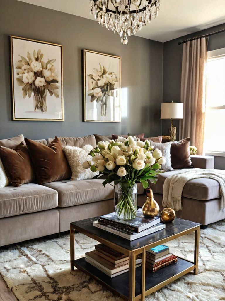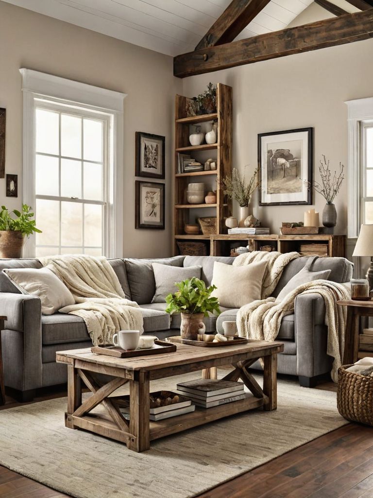 Indulgence: Imagine transforming your living room into a cozy oasis with a rustic chic theme. Add warmth and sophistication with hardwood floors and exposed wooden beams on the ceiling. Decorate with plush velvet sofas in deep earthy tones, complemented by textured throw pillows and thick woven blankets for a touch of luxury. Finish off the space with antique-inspired light fixtures and a statement gallery wall of vintage artwork, creating a space that embraces both comfort and nostalgia.