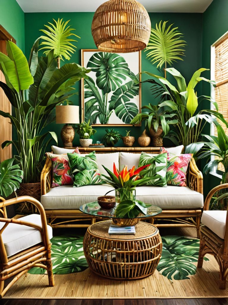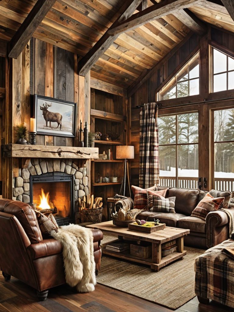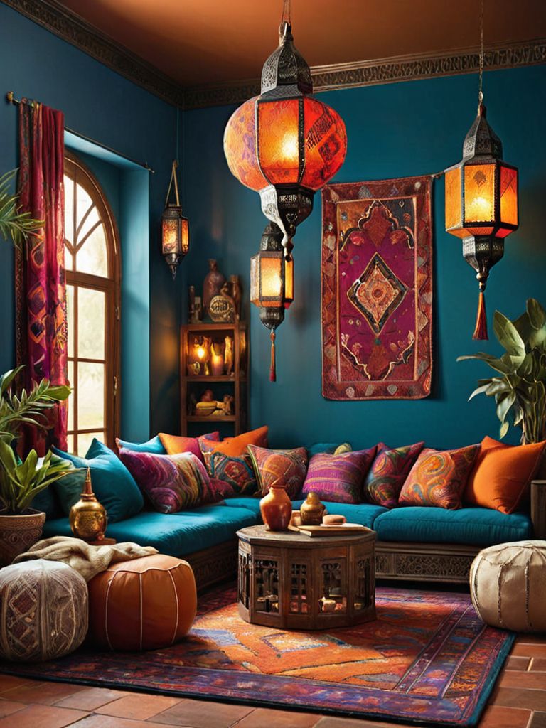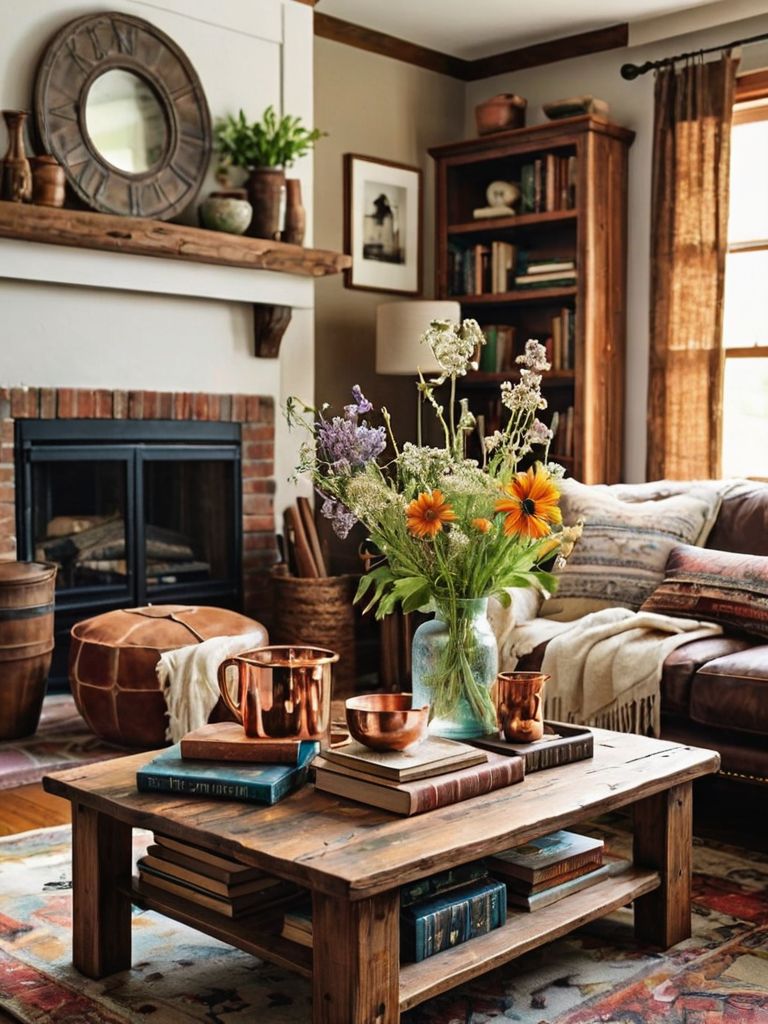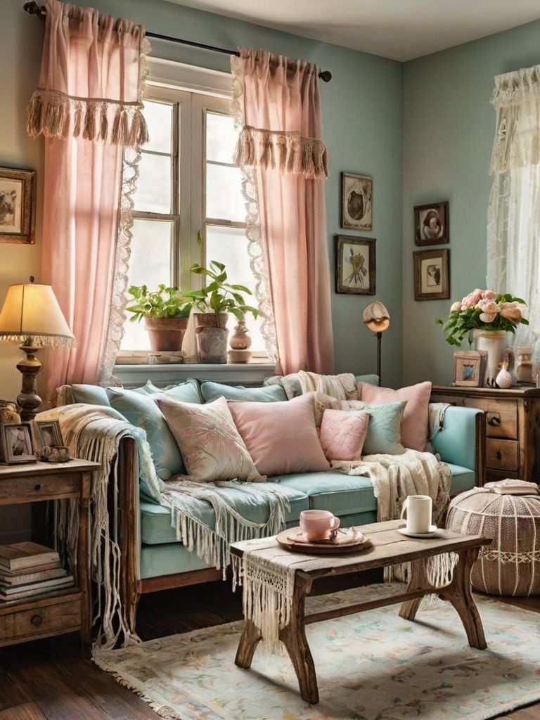 Furniture: Imagine a cozy living room adorned with plush sofas and armchairs, their vibrant cushions complementing the earthy tones of the wooden coffee table and bookshelves. Sunlight filters through decorative curtains, casting a warm glow on the vintage rug that sprawls across the floor, inviting you to curl up with a good book. The room is effortlessly chic, combining modern elements with rustic accents, creating a space that exudes comfort and style.