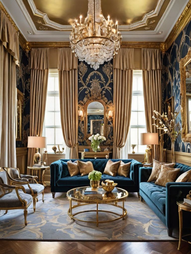Plush sofas, Armchairs, Wooden coffee table, Bookshelves, Decorative curtainsDescription
