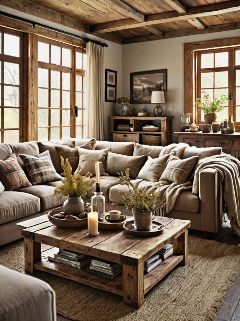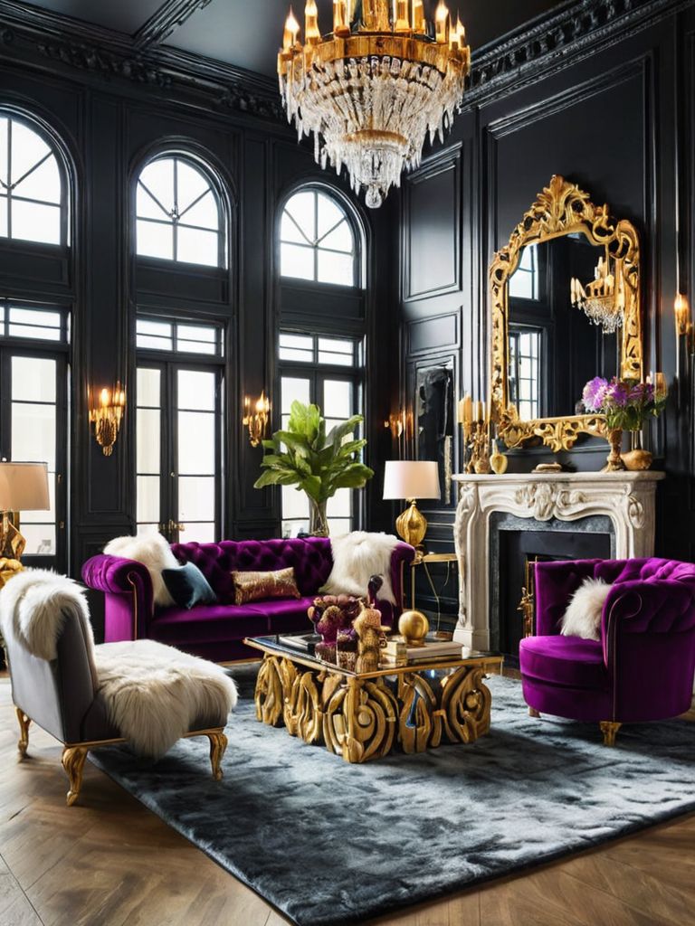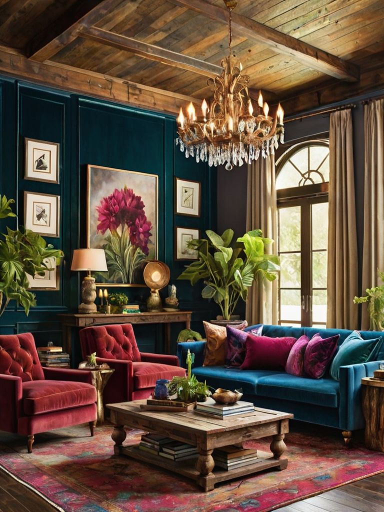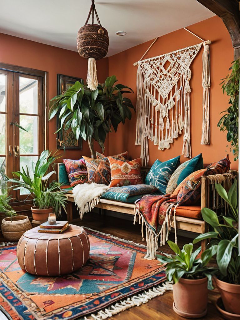 Colorful Bohemian Living Room: Create a vibrant and eclectic living space filled with an array of vivid patterns, rich textures, and bold colors. Start with a bohemian-inspired rug in hues of red, orange, and turquoise, complemented by an assortment of mismatched throw pillows in various sizes and textures. Show off your unique style with a collection of handcrafted artwork and vintage pieces, and complete the look with an oversized floor mirror and hanging macrame planters for a boho-chic vibe.