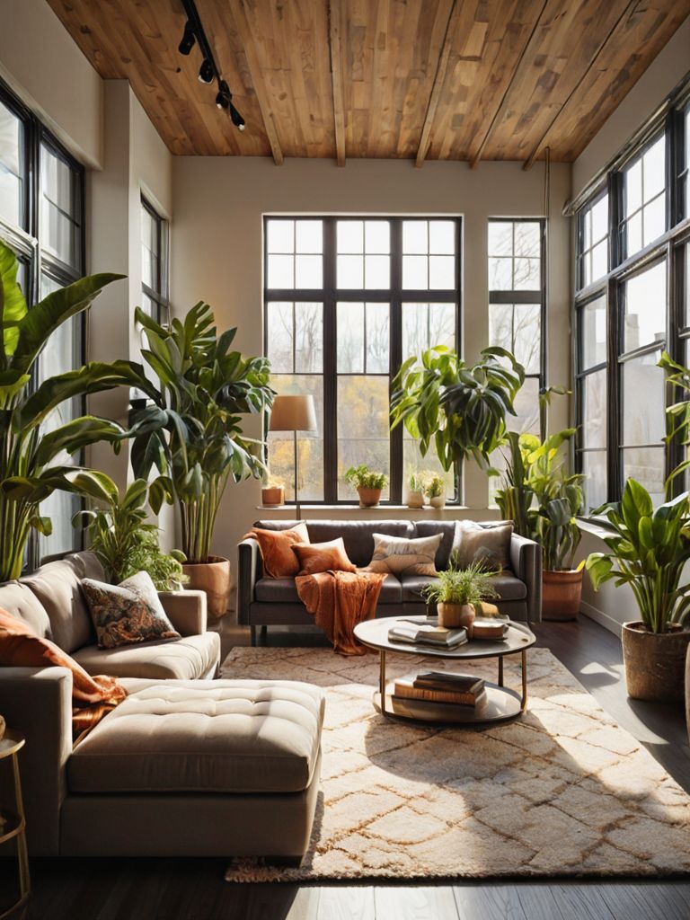 Furniture: Create a cozy and inviting living room with a blend of modern and rustic pieces. Start with a plush sectional sofa in a neutral color, complemented by a statement coffee table made from reclaimed wood. Enhance the warm ambiance with soft lighting from a floor lamp and add pops of color with decorative throw pillows and a faux fur rug.