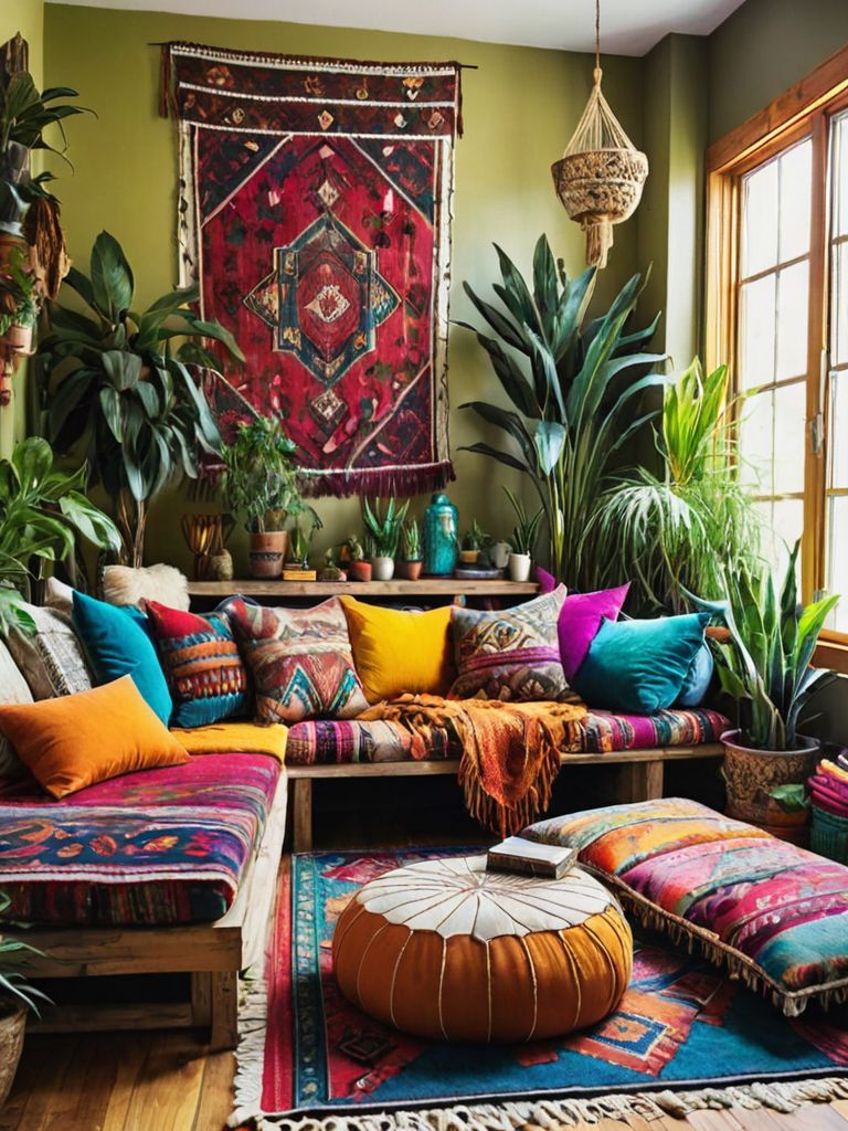 Tribal print throw pillows, Colorful tapestries, Mismatched throw pillows, Floating shelves, Potted plantsDescription