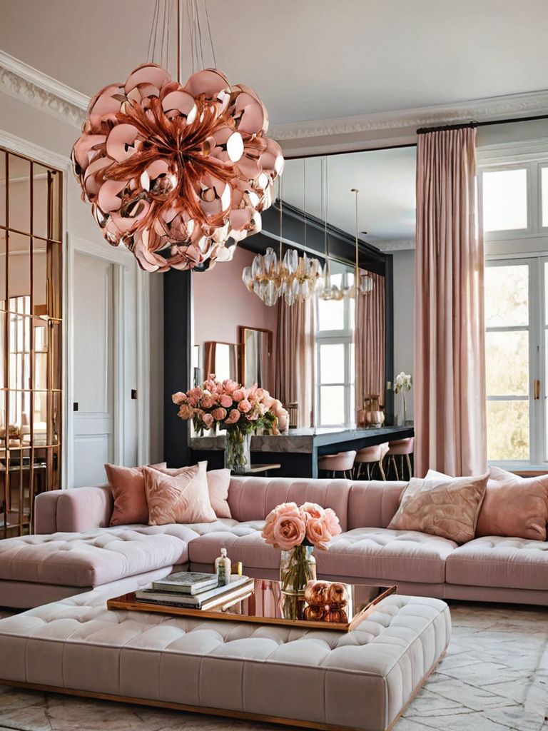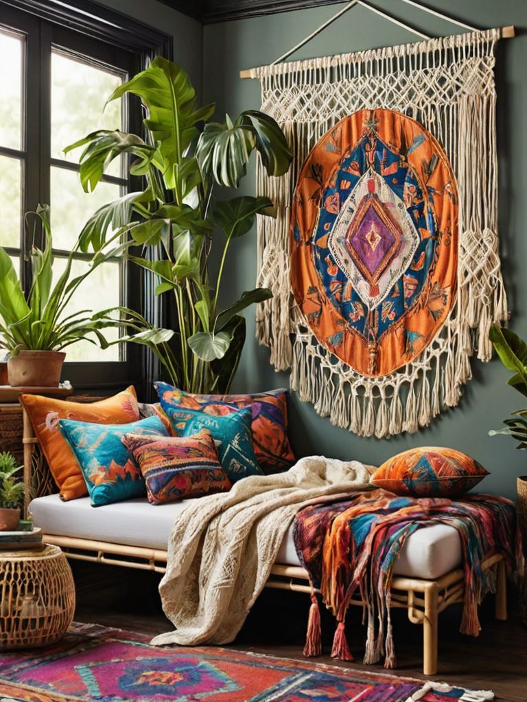 Geometric pattern wall art, Natural wood furniture, Plush neutral-colored upholstery, Faux fur rugs, Soft textured throw pillowsDescription