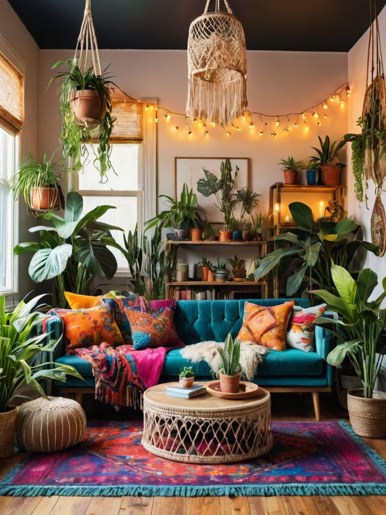 Patterned throw pillows, Rattan armchair, Potted plants, Macrame wall hanging, Eclectic art piecesDescription