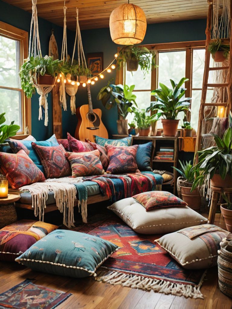 Vibrant tapestries, Plush floor cushions, Mismatched furniture, Potted plants, Macrame hanging plantersDescription