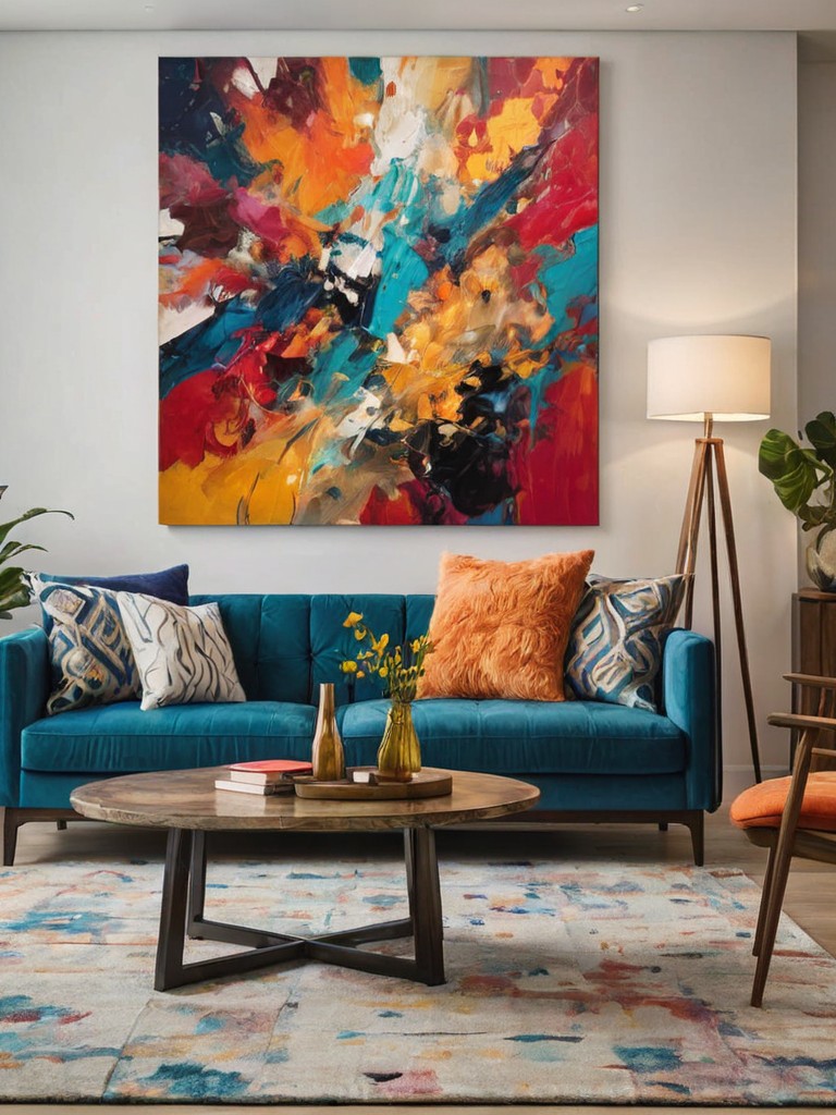 Abstract Art: Imagine transforming your living room into a modern art gallery with bold and vibrant abstract paintings adorning every wall. Picture how the rich hues and intricate brushstrokes illuminate the space, creating an atmosphere of creativity and inspiration. Envision complementing the artwork with sleek, minimalist furniture and soft, textured rugs, resulting in a harmonious and visually captivating living area.
