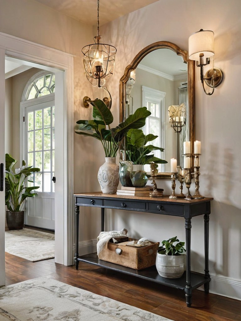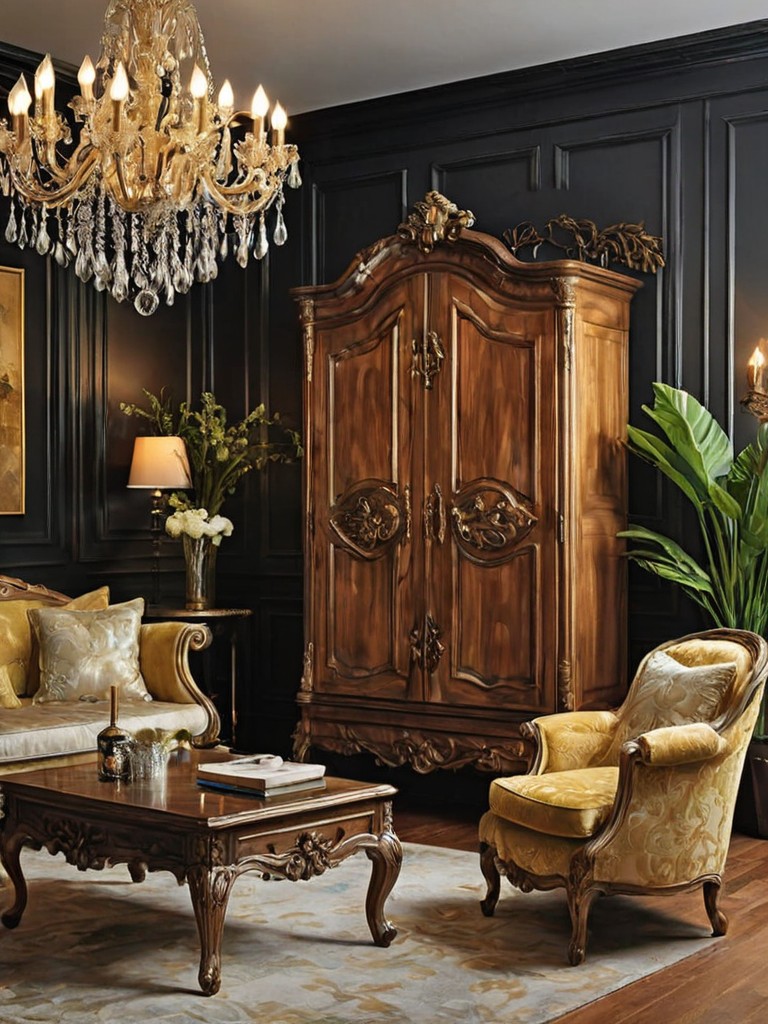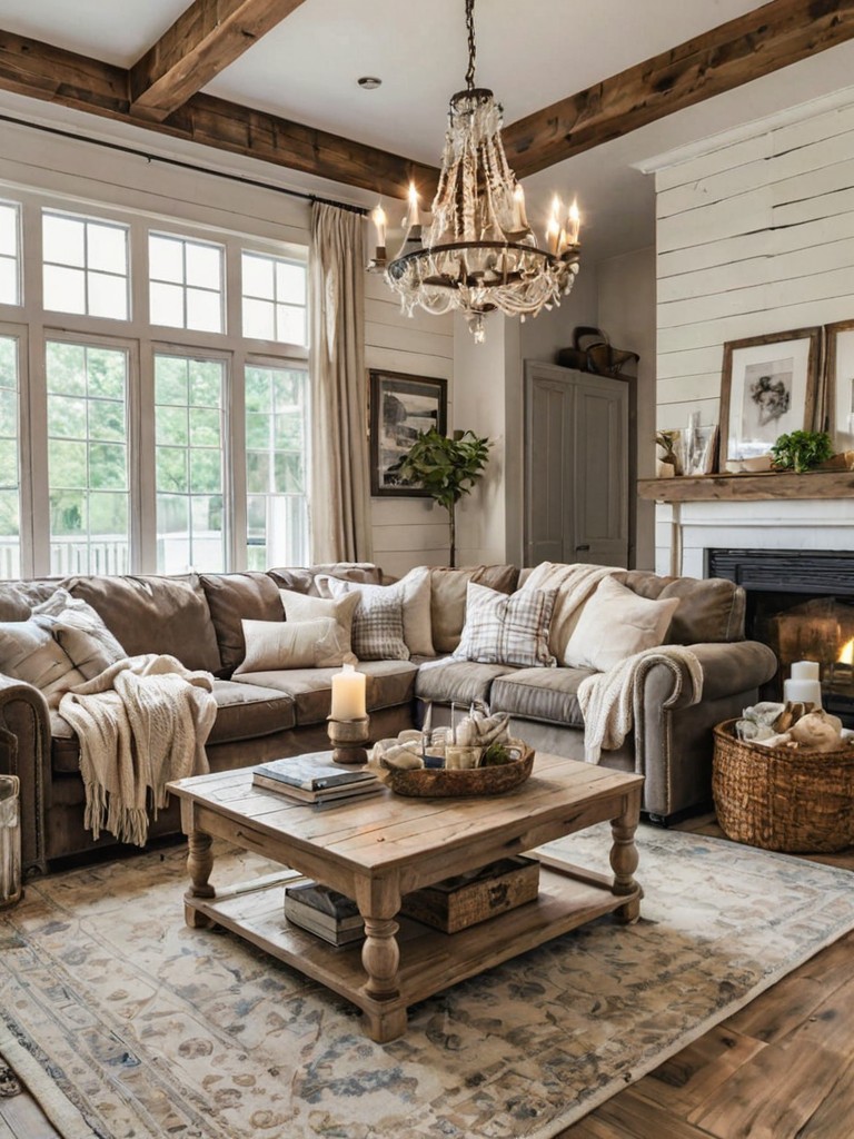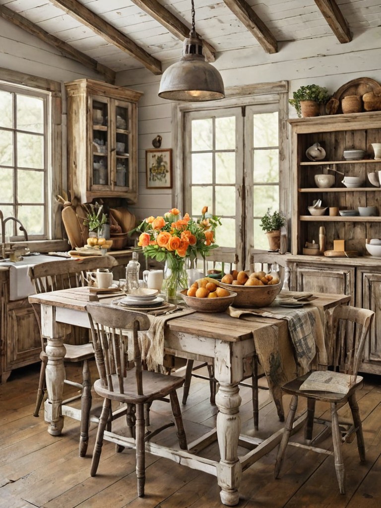 Distressed wood furniture, Exposed beams, Faux fur throws, Vintage candle holders, Earthy artworkDescription