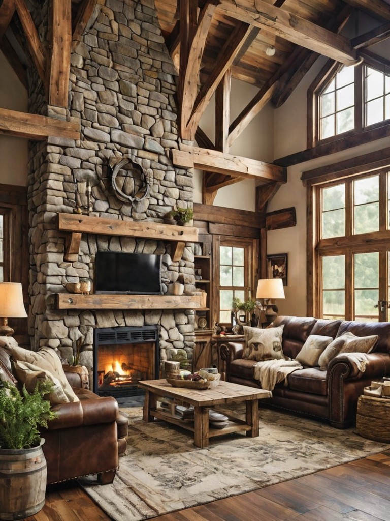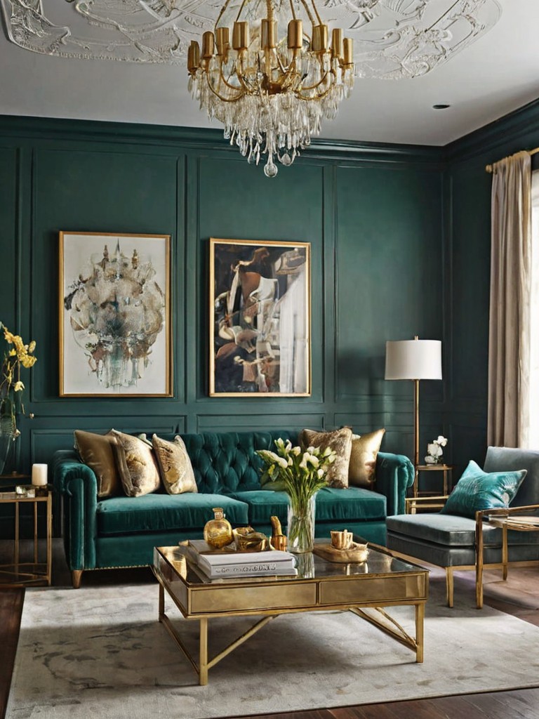 Chic Living Room Oasis: Picture a stunning vintage leather sofa, adorned with plush velvet pillows in deep jewel tones. Surrounding it, a gallery wall filled with eclectic art pieces, including a mix of abstract paintings and black-and-white photographs with ornate gold frames. Complete the look with a luxurious Moroccan rug, cascading floor-to-ceiling curtains, and a rustic reclaimed wood coffee table to create the ultimate cozy and sophisticated living room oasis.