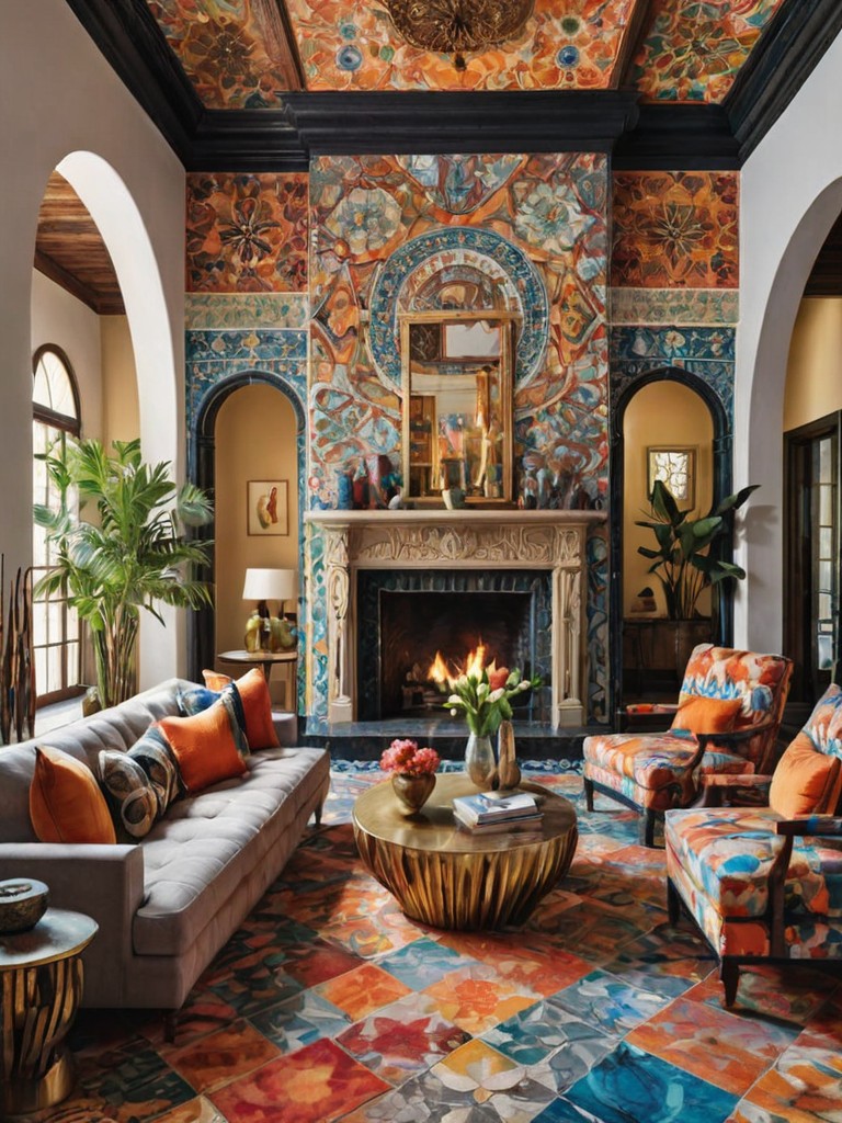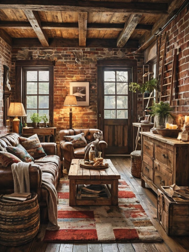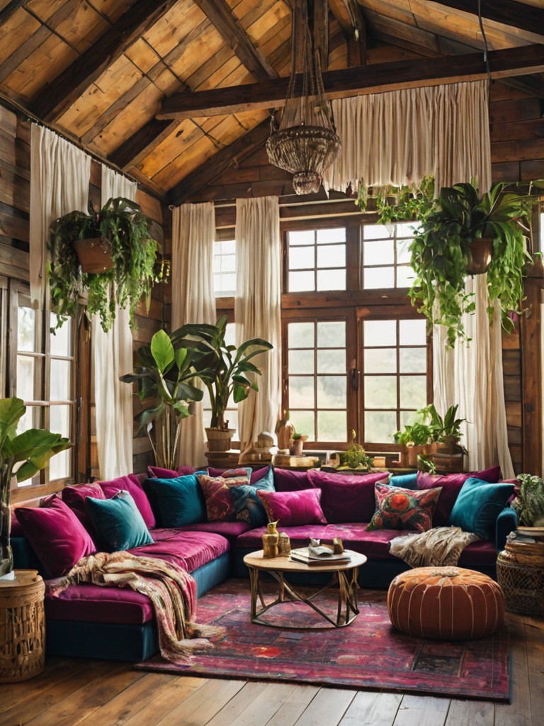 Vintage leather sofa, Plush velvet pillows, Eclectic art pieces, Moroccan rug, Reclaimed wood coffee tableDescription