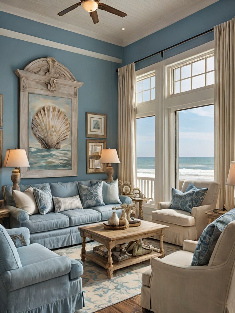 Seashell-adorned photo frames, Driftwood wall art, Nautical throw pillows, Blue and white striped throw blankets, Coastal-themed table lampsDescription