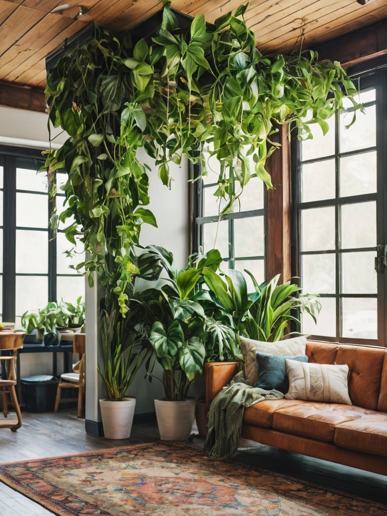 Moroccan rug, Indian tapestries, Oversized floor cushions, Hanging macramé planters, Plush velvet armchairDescription