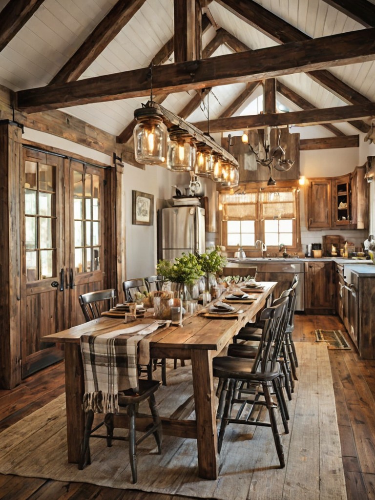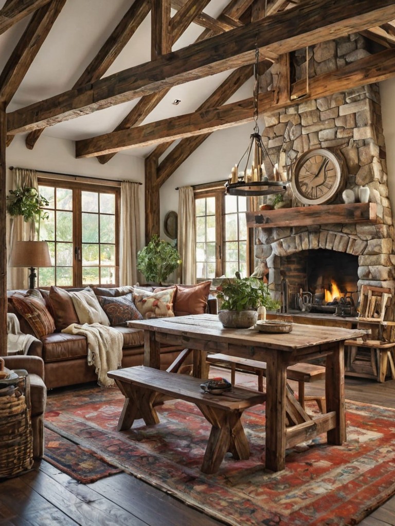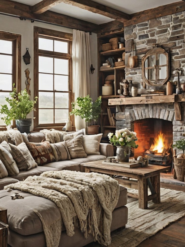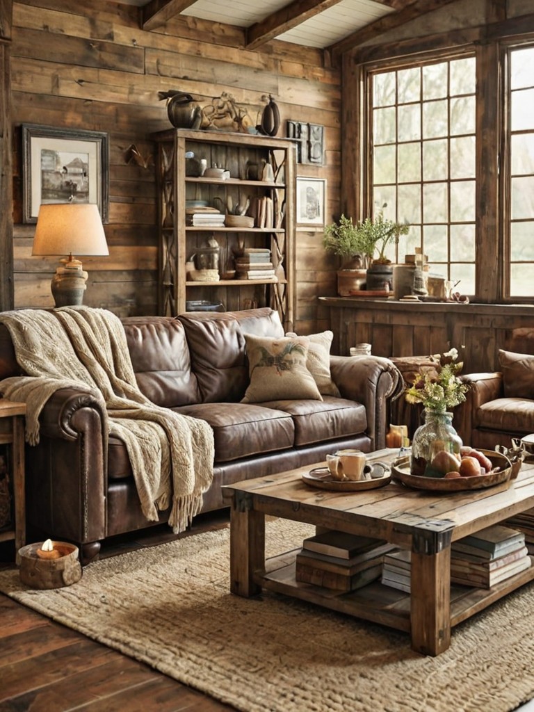 Wooden plank flooring, Distressed furniture, Vintage décor, Shiplap accent wall, Plush throw blanketsDescription