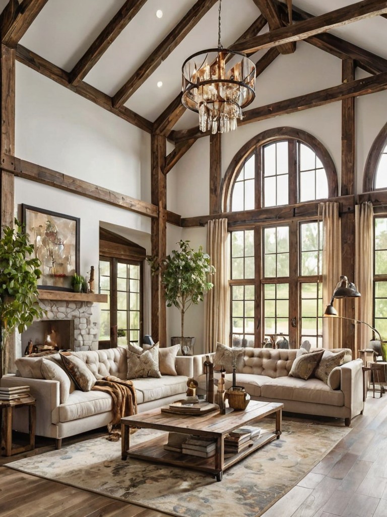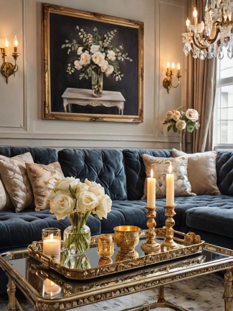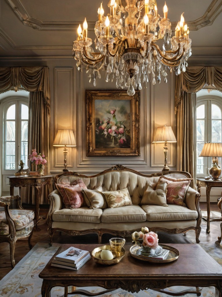 Exquisite Elegance: Embellish your living space with opulent touches of gold and crystal. Accentuate the luxurious vibe with plush velvet drapes that cascade down to the floor, framing the regal antique fireplace. Complete the refined look with a grand chandelier that twinkles with a multitude of sparkling crystals, casting a warm and inviting glow throughout the room.