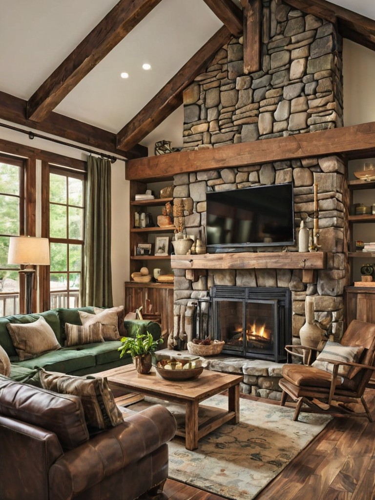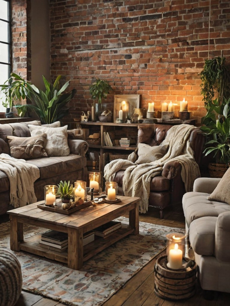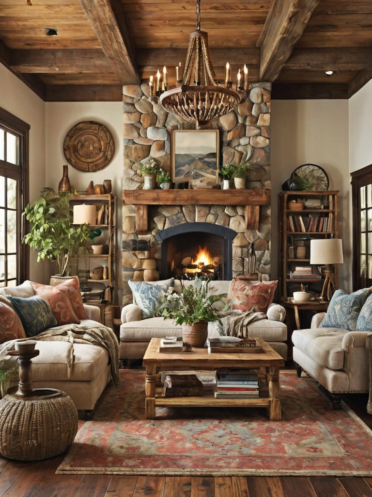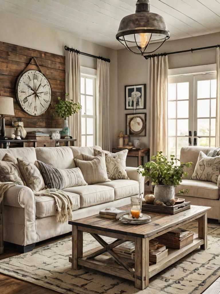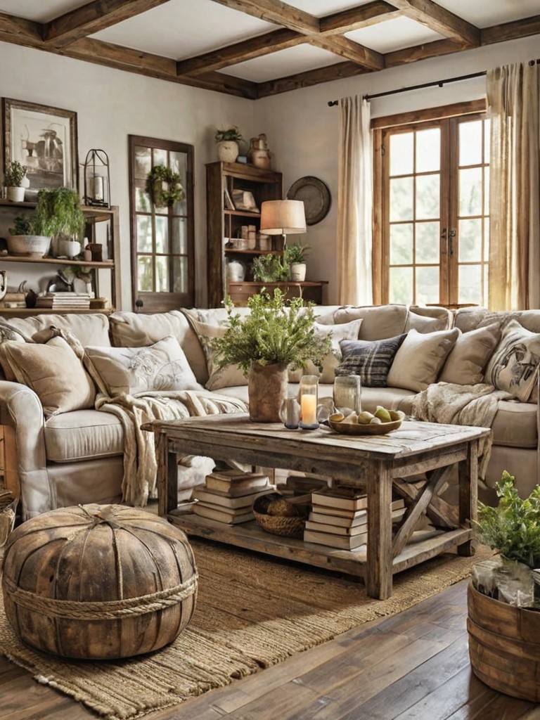 Reclaimed wood furniture, Distressed finishes, Vintage-inspired accents, Soft, neutral colors, Cozy textilesDescription