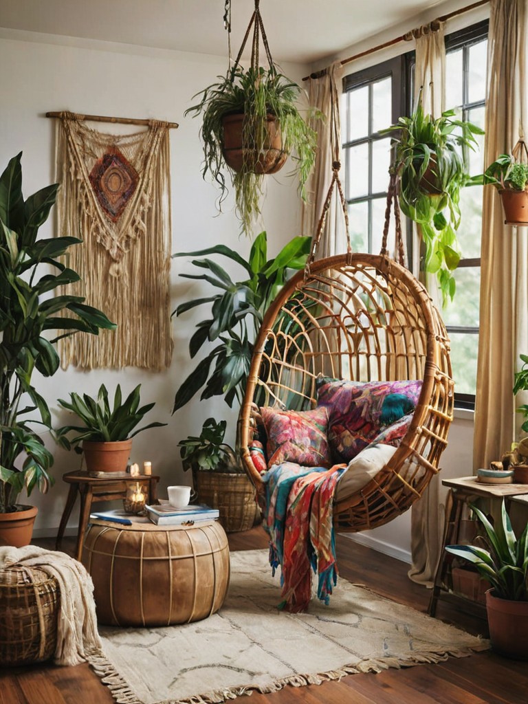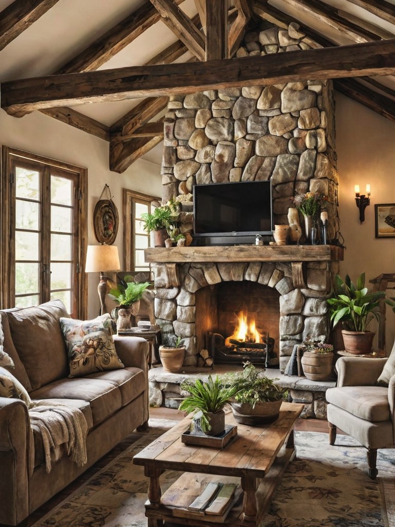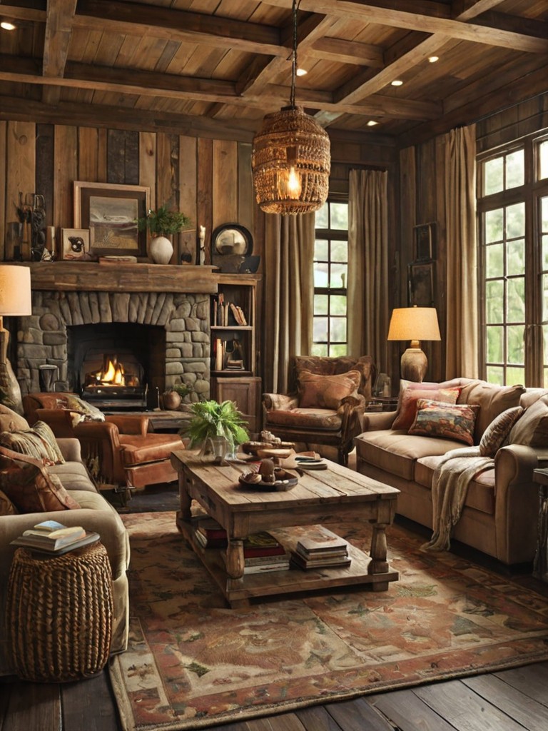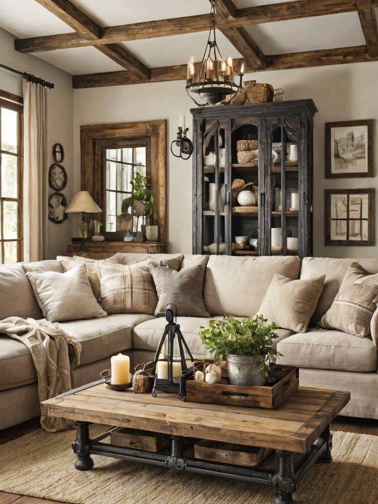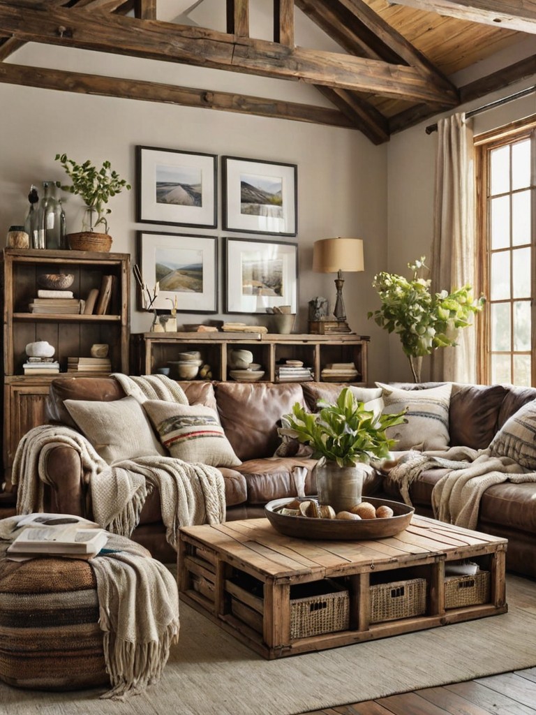 Living Room Decor: Create a cozy and inviting atmosphere with a rustic farmhouse theme. Start by selecting a comfortable sectional sofa with distressed leather upholstery and plaid throw pillows. Incorporate natural elements like a reclaimed wood coffee table, a sisal rug, and hanging macrame planters for a touch of bohemian charm.