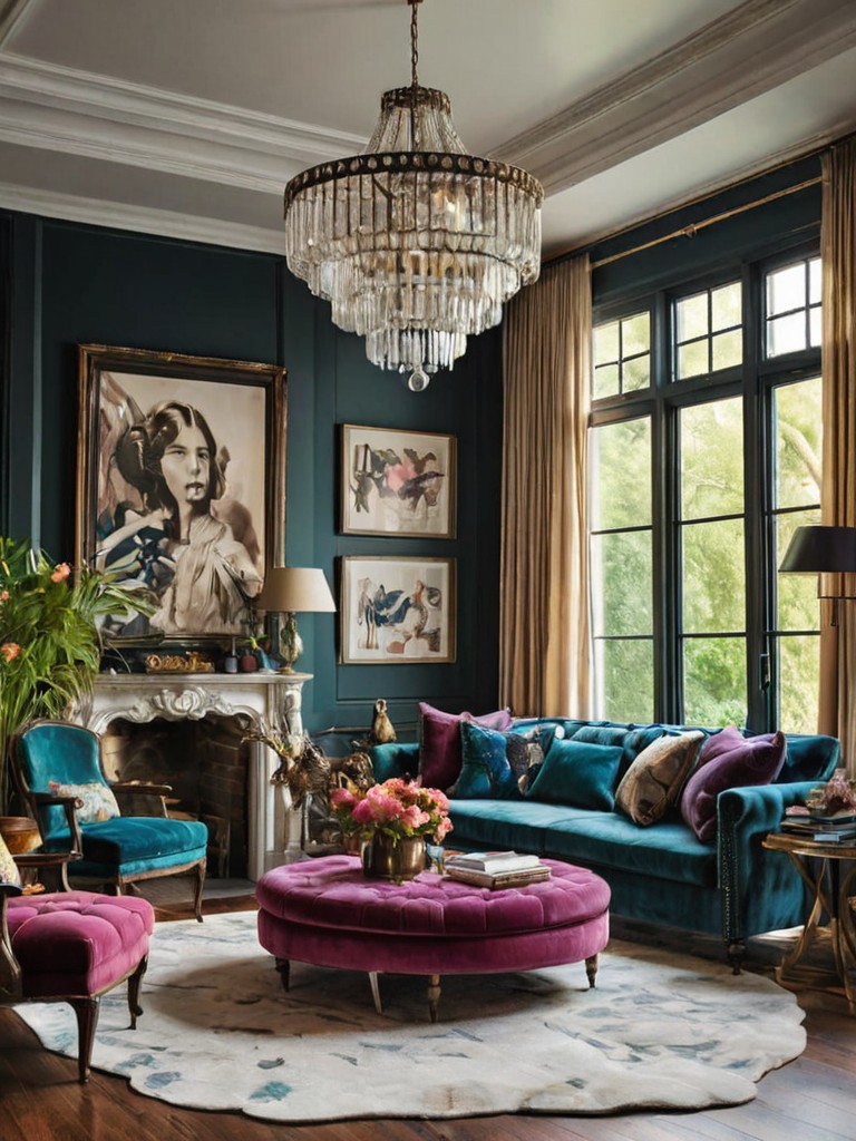 Deep jewel-toned blue paint, Vibrant accent pillows, Throw blankets in rich shades of fuchsia and gold, Unique wall art with abstract designs, Velvet poufs, Moroccan-inspired area rugDescription